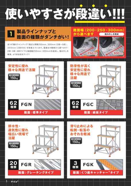 使いやすさが段違い!!!製品ラインナップと踏面の種類がダンチがい!踏面幅(200・250・300mm)から選べます踏み外しを軽減全147種のラインナップ!踏ざん間隔250mm、300mm(2段〜5段)、350mm(2段のみ)を取えています。踏面は4種類から選べます!2段・3段・4段タイプに踏面幅250mm・300mmを追加し、踏み外しを軽減、より安全性をアップ!250mm300mm安定性に優れ様々な用途で活躍最大使用質量150kg62種類FGN防滑性が高く安定性に優れ様々な用途で活躍最大使用質量150kg62種類FGC踏面:標準タイプ踏面:縞板タイプ踏面:グレーチングタイプ踏面:くつ底キャッチャー®タイプ1滑り止めによる転倒・転落のおそれを軽減最大使用質量150kgFGK類3種排水性・通気性に優れ幅広い現場で活躍最大使用質量150kg20種類FGR