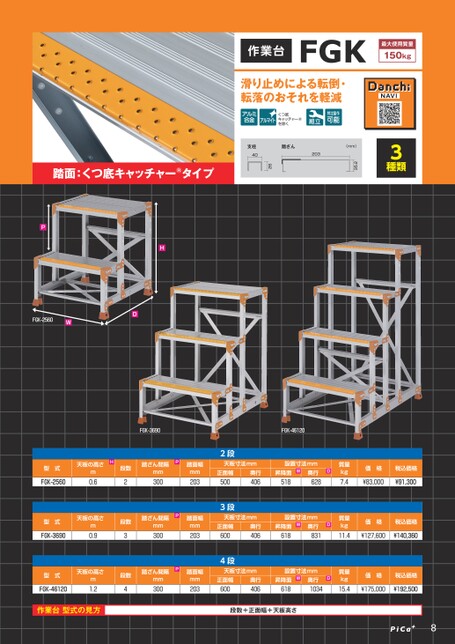 作業台FGK最大使用質量150kg滑り止めによる転倒・転落のおそれを軽減AEFMくつ底キャッチャー®を除く3種類35.2(mm)支柱40踏ざん20326踏面:くつ底キャッチャー®タイプPHFGK-2560WDFGK-3690FGK-46120型式FGK-2560H天板の高さm0.6型式FGK-3690天板の高さm0.9型式FGK-46120天板の高さm1.2作業台型式の見方段数2段数3段数4P踏ざん間隔mm300P踏ざん間隔mm300P踏ざん間隔mm300踏面幅mm203踏面幅mm203踏面幅mm2032段天板寸法mm正面幅500奥行406昇降面518設置寸法mmW奥行6283段天板寸法mm正面幅600奥行406昇降面618設置寸法mmW奥行8314段天板寸法mm正面幅600奥行406昇降面618設置寸法mmW奥行1034DDD質量kg7.4質量kg11.4質量kg15.4価格¥83,000税込価格¥91,300価格税込価格¥127,600¥140,360価格税込価格¥175,000¥192,500段数+正面幅+天板高さ8