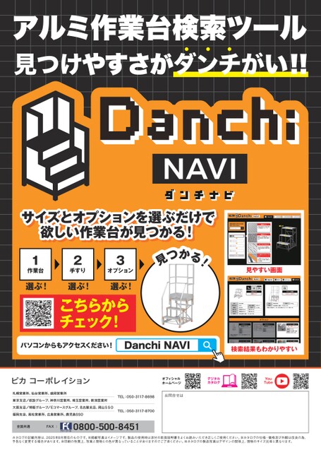 アルミ作業台検索ツール見つけやすさがダンチがい!!サイズとオプションを選ぶだけでョ選だサイズとオプションを選ぶだけで欲しい作業台が見つかる!し欲しい作業台が見つかる!つかる!見見やすい画面1作業台2手すり選ぶ!選ぶ!3オプション選ぶ!こちらからチェック!パソコンからもアクセスください!DanchiNAVI検索結果もわかりやすいオフィシャルホームページデジタルカタログYouTube札幌営業所、仙台営業所、盛岡営業所東京支店/仮設グループ、神奈川営業所、埼玉営業所、新潟営業所大阪支店/特販グループ/Eコマースグループ、名古屋支店、岡山SSO福岡支店、高松営業所、広島営業所、鹿児島SSOTEL:050-3117-8698お問合せはTEL:050-3117-8700全国共通FAX:0800-500-8451カタログの記載内容は、2025年8月現在のものです。※掲載写真はイメージです。製品の使用時は添付の取扱説明書をよくお読みいただき正しくご使用ください。※カタログの仕様・価格及び外観は改良の為、予告なく変更する場合があります。※印刷の性質上、写真と現物との色が異なっていることがありますのでご了承ください。※カタログの製品写真はデザインの関係上、現物のサイズ比率と異なります。