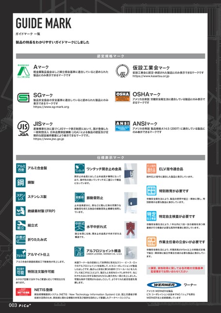 GUIDEMARKガイドマーク一覧製品の特長をわかりやすいガイドマークにしました認定規格マークTAマーク軽金属製品協会はしご脚立部会基準に適合していると認められた製品にのみ表示できるマークですU仮設工業会マーク仮設工業会に認定・承認された製品にのみ表示できるマークですhttps://www.kasetsu.or.jpSGマーク製品安全協会の安全基準に適合していると認められた製品にのみ表示できるマークですhttps://www.sg-mark.orgJISマーク産業標準化法に基づくJISマーク表示制度において、国が登録した一般財団法人日本品質保証機構(JQA)による製品の認証及び定期的な認証維持審査により表示できるマークです。https://www.jisc.go.jpOSHAマークアメリカ合衆国労働安全衛生法に適合している製品にのみ表示できるマークですANSIマークアメリカ合衆国製品規格A14.5(2007)に適合している製品にのみ表示できるマークですNOQPアルミ合金製鋼製ステンレス製絶縁素材製(FRP)組立式折りたたみ式アルマイト仕上ACDBFHEMアルミ合金の表面処理加工で耐食性が向上します。特別注文製作可能カタログ記載寸法外でもご要望に応じて特別注文を承ります。仕様表示マークワンタッチ開き止め金具J開き止め金具とはしご止め金具が兼用になっており、操作性の良いワンタッチ式二重ロック構造になっています。K振動音防止止め金具部分に、車などに積んだ時の耳障りな振動音を抑える独自の振動音防止機構を採用しています。L水平中折れ式脚立を閉じる時、開き止め金具が中央で折れる構造です。Iアルフロジョイント構造UNDERLICENSE,WERNERCO.,U.S.A米国ワーナー社の技術として世界的に有名なスリー・ピース・ロックのアルフロジョイントを採用して、ピカコーポレイションが製造したはしごです。踏ざんと支柱に第3の部材(ファールール)を入れプレス加工することにより、踏ざんと支柱をロックしますので、ねじれやたわみに対する強さはもちろん耐久性も一段と向上しました。苛酷な条件で使用されるはしごとして、よりすぐれた総合性能を発揮します。NETIS登録新技術情報提供システム(NETIS:NewTechnologyInformationSystem)とは、国土交通省が新技術の活用のため、新技術に関わる情報の共有及び提供を目的として整備したデータベースシステム003ELV指令適合品欧州ELV指令に適合した製品に表示しています。特別教育が必要です労働安全衛生法により、製品の使用や組立・解体に際し、特別教育が必要な製品に表示しています。特定自主検査が必要です労働安全衛生法により、1年以内に1回一定の資格を持つ検査者が行う検査が必要な高所作業車に表示しています。作業主任者の立会いが必要です労働安全衛生法により、作業床高さが5m以上の移動式足場で組立・解体時に組立作業主任者が必要な製品に表示しています。※講習、資格取得に関しては各所轄の労働基準監督署までお問い合わせくださいワーナーアメリカWERNER社製品ピカコーポレイションは全米でNO.1シェアを誇るWERNER社と技術提携しています