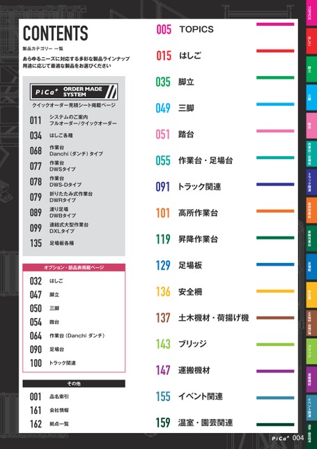 TOPICSはしご脚立三脚踏台作業台・足場台トラック関連高所作業台昇降作業台足場板安全柵土木機材・荷揚げ機ブリッジ運搬機材イベント関連温室・園芸関連004CONTENTS製品カテゴリー一覧あらゆるニーズに対応する多彩な製品ラインナップ用途に応じて最適な製品をお選びくださいクイックオーダー見積シート掲載ページ011034068077078079089099135032047050054064090100001161162システムのご案内フルオーダー/クイックオーダーはしご各種作業台Danchiダンチ)タイプ作業台DWSタイプ作業台DWS-Dタイプ折りたたみ式作業台DWRタイプ渡り足場DWBタイプ連結式大型作業台DXLタイプ足場板各種オプション・部品表掲載ページはしご脚立三脚踏台作業台(Danchiダンチ)足場台トラック関連その他品名索引会社情報拠点一覧005015035049051055091101119129136137143147155159TOPICSはしご脚立三脚踏台作業台・足場台トラック関連高所作業台昇降作業台足場板安全柵土木機材・荷揚げ機ブリッジ運搬機材イベント関連温室・園芸関連