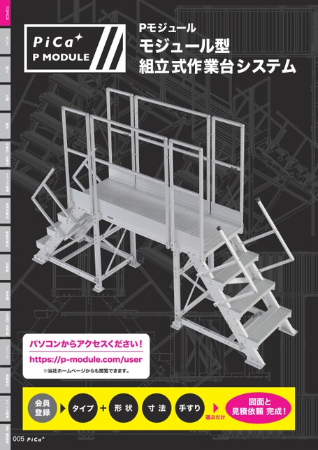 Pモジュールモジュール型組立式作業台システム※当社ホームページからも閲覧できます。TOPICSはしご脚立三脚踏台作業台・足場台トラック関連高所作業台昇降作業台足場板安全柵土木機材・荷揚げ機ブリッジ運搬機材イベント関連温室・園芸関連005