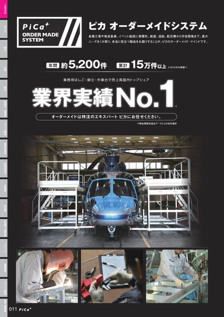 ピカオーダーメイドシステム各種工場や物流倉庫、イベント施設に発電所、鉄道、造船、航空機から宇宙開発まで。真のニーズをくみ取り、本当に役立つ製品をお届けすることが、ピカのオーダーメイド・マインドです。年間約5,200件累計15万件以上※2010年以降調べ業務用はしご・脚立・作業台で売上高国内トップシェア業界実績No.1オーダーメイドは特注のエキスパートピカにお任せください。※※軽金属製品協会データによる当社集計TOPICSはしご脚立三脚踏台作業台・足場台トラック関連高所作業台昇降作業台足場板安全柵土木機材・荷揚げ機ブリッジ運搬機材イベント関連温室・園芸関連011