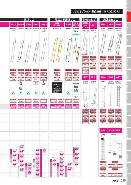 TOPICSはしご脚立三脚踏台作業台・足場台トラック関連高所作業台昇降作業台足場板安全柵土木機材・荷揚げ機ブリッジ運搬機材イベント関連温室・園芸関連はしごオプション・部品表は▶P.032-033へ1連はしご1ALF1CSMSWASWJ1PRO電気工事用はしごFRPSWK2L /1LGLD2連 /1連最大使用質量150kgスタンダードタイプ軽量コンパクトサイズ両面使用型階段はしご最大使用質量130kgで軽量FRP製2連・1連電柱昇降用最大使用質量130kgのFRP製2連・1連伸縮はしごPTHSLNEWPTH-HSソフトスライド自在脚タイプ用途別はしごLRSSWPSWM長尺タイプロフト等室内向け住宅建築向け階段はしご住宅建築向け階段はしご生産終了品→P.023→P.023→P.023→P.024→P.024→P.025→P.024→P.025最大使用質量150kg最大使用質量100kg最大使用質量100kg最大使用質量150kg最大使用質量130kg使用角度75度使用角度75度使用角度75度使用角度75度使用角度60度70度最大使用質量100kg使用角度75度最大使用質量100kg最大使用質量130kg使用角度75度使用角度75度TTTTTTバリエーション4サイズバリエーション6サイズバリエーション3サイズバリエーションバリエーション7サイズ1サイズバリエーション2サイズバリエーション6サイズバリエーション2サイズ3.1〜6.1m2.4〜5.3m2.0〜5.0m1.2〜4.1m1.8〜3.0m1.0〜2.2m2.0〜4.0m1.2〜3.1m6.2m5.3m1.8〜4.0m1.0〜3.2m2.1・2.4m2.0・2.3m2連タイプ1連タイプバリエーション4サイズ3.2〜6.5m2.2〜5.5mNEW→P.026→P.027→P.027→P.028→P.028最大使用質量100kg使用角度75度バリエーション3サイズPTH-HS2サイズ最大使用質量100kg使用角度75度バリエーション7サイズ最大使用質量100kg最大使用質量150kg最大使用質量150kg使用角度70度使用角度60度使用角度60度バリエーション2サイズバリエーション3サイズバリエーション2サイズSLTSLGSWCSWEQSTロフト等室内向け長尺タイプフルセット公団仕様林業用枝打ちはしごマンホール用吊り下げ式→P.025→P.027→P.029→P.029→P.029最大使用質量100kg最大使用質量100kg使用角度75度使用角度75度最大使用質量100kg最大使用質量100kg最大使用質量100kg使用角度90度使用角度80度使用角度90度バリエーション3サイズバリエーション1サイズバリエーション2サイズバリエーション2サイズバリエーション2サイズQQLEK/ER/ES避難用伸縮吊り下げ式避難用はしご1ALF-616.15.31ALF-515.4.1ALF-414.13.31ALF-313.12.41CSM-505.04.11CSM-404.03.11CSM-373.72.81CSM-301CSM-243.02.12.41.51CSM-202.01.21PRO-616.25.3SWJ-404.03.1SWJ-373.72.8SWJ-333.32.5SWJ-303.02.2SWJ-27SWJ-23SWJ-202.71.92.31.62.01.2※SWJの接点高さは70度使用時2連タイプFRP-2L404.03.2FRP-2L343.42.6SWA-30CSWA-24CSWA-18C3.02.22.41.61.81.01連タイプFRP-1L303.2.FRP-1L30GFRP-1L24FRP-1L24GFRP-1L18FRP-1L18G3.2.2.1.2.2.1.1.1.1.GLD-65WA6.55.5GLD-53WA5.34.3GLD-44W4.43.4GLD-32W3.22.2SWK-B24C2.42.3SWK-B20C2.12.0→P.029最大使用質量100kg使用角度90度→P.030最大使用質量EK600kg ・ 760kg ER195kg ES195kg使用角度90度バリエーション1サイズバリエーションEK27サイズ ER6サイズ ES4サイズ018