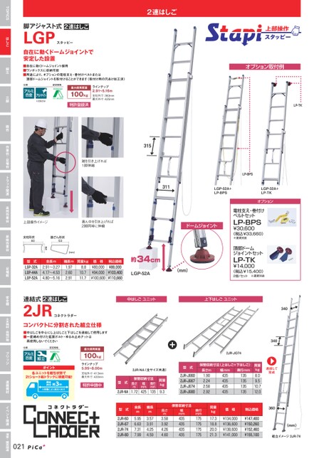 脚アジャスト式 2連はしごLGPスタッピー自在に動くドームジョイントで安定した設置■自在に動くドームジョイント採用■ワンボックスに収納可能■用途により、オプションの電柱支え・巻付けベルトまたは頂部ドームジョイントを取付けることができます(取付け用の穴あけ加工済)仕様AE※支柱のみ認定規格Tラインナップ2.91〜5.16m支柱外寸:363mm最大外寸:425mm最大使用質量100kg特許登録済2連はしごオプション取付例LP-TK311▶◀LGP-52A+LP-BPSLP-BPSLGP-32A+LP-TKオプション▶◀315端を引き上げれば1脚伸縮真ん中を引き上げれば2脚同時に伸縮ドームジョイント電柱支え・巻付けベルトセットLP-BPS¥30,600(税込¥33,660)※運賃別途頂部ドームジョイントセットLP-TK¥14,000(税込¥15,400)2個/セット※運賃別途◀約34cmLGP-52A▶(mm)中はしごユニット上下はしごユニット53踏ざん形状型式LGP-32ALGP-44ALGP-52A全長m(mm)2.91〜3.27417〜4.534.80〜5.16縮長m1.972.602.91質量kg8.810.711.7価格¥80,000¥94,000¥100,600税込価格¥88,000¥103,400¥110,660連結式 2連はしご2JRコネクトラダーコンパクトに分割された組立仕様▶26(mm)上部操作イメージ支柱形状60支柱形状60踏ざん形状5326340◀▶▶340◀2JR-JG74型式2JR-JG602JR-JG672JR-JG742JR-JG80保管収納寸法(上はしご+下はしご)長さm1.902.242.582.92幅mm435435435435奥行mm135135135135質量kg8.09.510.712.0連結して完成奥行mm175175175175質量kg17.318.820.021.3価格税込価格360◀▶¥134,000¥136,600¥138,600¥141,000¥147,400¥150,260¥152,460¥155,100(mm)組立イメージ2JR-74保管収納寸法m435435435435幅m2JR-NA(全サイズ共通)質量kg9.3奥行mm135保管収納寸法m425幅m長さm1.72全長m5.956.637.317.99縮長m3.573.914.254.59長さm3.583.924.264.60■中はしごを中心にし上はしごと下はしごを連結して使用します■一度締め付けた低頭ボルト・ゆるみ止めナットは再使用しないでください仕様認定規格AFTポイント各ユニットを梱包状態で2tショート箱トラックに積載可能!最大使用質量100kgラインナップ5.95〜8.00m支柱外寸:413mm最大外寸:433mm特許申請中型式2JR-NA型式2JR-602JR-672JR-742JR-80021TOPICSはしご脚立三脚踏台作業台・足場台トラック関連高所作業台昇降作業台足場板安全柵土木機材・荷揚げ機ブリッジ運搬機材イベント関連温室・園芸関連