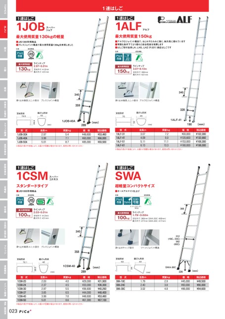 1連はしご1JOBスーパージョブ最大使用質量130kgの軽量■JIS1300形規格品■プレスジョイント構造で最大使用質量130kgを実現しました認定規格仕様AT最大使用質量130kgラインナップ2.97〜5.01m支柱外寸:412mm最大外寸:431mm1連はしご1連はしご1ALFアルフ最大使用質量150kg■アルフロジョイント構造で、ねじれやたわみに強く、耐久性に優れています■苛酷な条件下でより優れた総合性能を発揮します■はしご取付金具LH、LHS、LHZ(P.031)適応はしごです仕様AI認定規格T最大使用質量150kgラインナップ3.07〜6.13m支柱外寸:392mm最大外寸:421mm(mm)税込価格¥102,300¥132,660¥168,300¥198,000▶340◀328◀▶1ALF-41▶◀190(mm)32(mm)◀2891JOB-40A(mm)26.932滑り止め端具ユニット部分アルフロジョイント構造75支柱形状支柱形状75踏ざん形状45▶340◀359◀▶▶26.9滑り止め端具ユニット部分72.5プレスジョイント構造支柱形状支柱形状72.5踏ざん形状4242踏ざん形状型式1JOB-30A1JOB-40A1JOB-50A(mm)全長m2.973.995.01質量kg5.47.18.7価格¥48,600¥60,000¥85,000税込価格¥53,460¥66,000¥93,500※製品の長さや地域により、お届けが困難な場合があります。都度お問い合わせください踏ざん形状型式451ALF-311ALF-411ALF-511ALF-61(mm)全長m3.074.095.116.13質量kg7.29.011.113.3価格¥93,000¥120,600¥153,000¥180,000※製品の長さや地域により、お届けが困難な場合があります。都度お問い合わせください1連はしごSWA超軽量コンパクトサイズ■オールアルマイト仕上げ仕様AEM※クイックオーダー対応品認定規格T最大使用質量100kgラインナップ1.79〜3.02m支柱外寸:360mm(SWA-30C:400mm)最大外寸:377mm(SWA-30C:417mm)▶306◀滑り止めキャップ部分支柱形状53リベットジョイント構造312(18C、24C)352(30C)◀▶支柱形状53踏ざん形状43▶340◀358◀▶▶26.5支柱形状72.1踏ざん形状42滑り止め端具ユニット部分プレスジョイント構造72.1支柱形状■JIS1000形規格品認定規格仕様AT最大使用質量100kgラインナップ2.03〜5.01m支柱外寸:412mm最大外寸:431mm1連はしご1CSMスーパーコスモススタンダードタイプ▶SWA-30C質量kg2.93.84.8226◀(mm)価格¥45,000¥60,000¥86,000税込価格¥49,500¥66,000¥94,60024(mm)全長m1.792.403.0224踏ざん形状型式43SWA-18CSWA-24CSWA-30C(mm)全長m2.032.372.973.653.995.01質量kg4.04.55.56.57.08.6価格¥29,000¥33,000¥36,600¥44,000¥48,600¥61,000税込価格¥31,900¥36,300¥40,260¥48,400¥53,460¥67,100(mm)◀2891CSM-40(mm)26.5踏ざん形状型式421CSM-201CSM-241CSM-301CSM-371CSM-401CSM-50(mm)※製品の長さや地域により、お届けが困難な場合があります。都度お問い合わせください023TOPICSはしご脚立三脚踏台作業台・足場台トラック関連高所作業台昇降作業台足場板安全柵土木機材・荷揚げ機ブリッジ運搬機材イベント関連温室・園芸関連