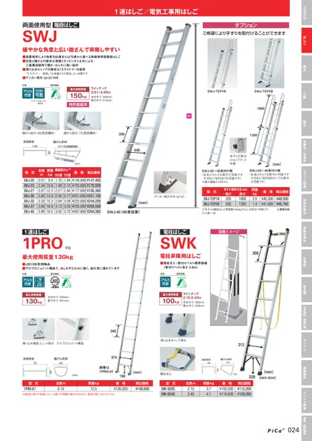 TOPICSはしご脚立三脚踏台作業台・足場台トラック関連高所作業台昇降作業台足場板安全柵土木機材・荷揚げ機ブリッジ運搬機材イベント関連温室・園芸関連1連はしご/電気工事用はしご▶オプションご希望により手すりを取付けることができますSWJ-TEP1BSWJ-TEP2B▶1860◀▶1350◀(mm)SWJ-33〜40取付け例(左右どちらでも取付け可能です※SWJ-TEP2Bを4つでも取付け可能です)手すりの取付けはノブナット仕様H▶330◀440◀▶◀▶151mm支柱形状140▶◀140mm踏ざん部分(70度設置時)30踏ざん部分(60度設置時)支柱形状140踏ざん形状151(60度使用時)踏ざん形状151(60度使用時)140(70度使用時)(mm)30(mm)m全長型式140(70度使用時)SWJ-20.012.34SWJ-232.67SWJ-273.00SWJ-30SWJ-333.333.66SWJ-37SWJ-403.99質量kg9.410.812.313.815.316.818.2H垂直高さm60度70度1.841.702.151.992.462.272.772.562.843.083.393.133.423.70価格税込価格¥134,000¥155,000¥177,600¥201,000¥222,000¥235,000¥267,600¥147,400¥170,500¥195,360¥221,100¥244,200¥258,500¥294,360アンカー用穴付き(φ12)(mm)◀SWJ-40(60度設置)両面使用型 階段はしごSWJ緩やかな角度と広い踏ざんで昇降しやすい■設置場所により角度を60度または70度から選べる両面使用型階段はしご■支柱と踏ざんの接合は溶接とタッピンネジ止めによる二重構造採用で揺れ・ねじれに強い設計■滑り止めキャップの素材は*エラストマーを採用*エラストマー焼却しても有毒ガスが発生しない材質です■アンカー用穴(φ12)付き仕様AM※クイックオーダー対応品認定規格T最大使用質量150kg特許登録済ラインナップ2.01〜3.99m支柱外寸:500mm最大外寸:516mmSWJ-20〜30取付け例(左右どちらでも取付け可能です※SWJ-TEP2Bでも可能です)※縦の連結はできません価格税込価格¥45,000¥41,600¥49,500¥45,760※運賃別途型式SWJ-TEP1BSWJ-TEP2B手すり単体寸法mm長さ18601350高さ205205質量kg2.01.4※手すりは階段はしご昇降面の左右どちらにも取付け可能です※入数:1本設置イメージ▶306◀電柱はしごSWK電柱昇降用はしご■電柱支え・巻付けベルト標準装備(巻付けベルト長さ:2.8m)仕様A認定規格T最大使用質量100kgラインナップ2.10・2.40m支柱外寸:360mm最大外寸:406mm(mm)SWK-B24C024▶◀22824(mm)支柱形状49踏ざん形状43価格¥102,000¥116,600税込価格¥112,200¥128,26024踏ざん形状43質量kg3.74.1(mm)全長m2.102.40電柱支え型式SWK-B20CSWK-B24C滑り止めキャップ部分支柱形状49312◀▶▶340◀374◀▶画像は1PRO-41▶190◀(mm)(mm)2626支柱形状滑り止め端具ユニット部分75アルフロジョイント構造支柱形状75踏ざん形状45踏ざん形状型式451PRO-61全長m6.16質量kg12.5価格¥135,000税込価格¥148,500※製品の長さや地域により、お届けが困難な場合があります。都度お問い合わせください(mm)■JIS1300形規格品■アルフロジョイント構造で、ねじれやたわみに強く、耐久性に優れています仕様認定規格AI最大使用質量130kgT支柱外寸:426mm最大外寸:461mm1連はしご1PROプロ最大使用質量130kg