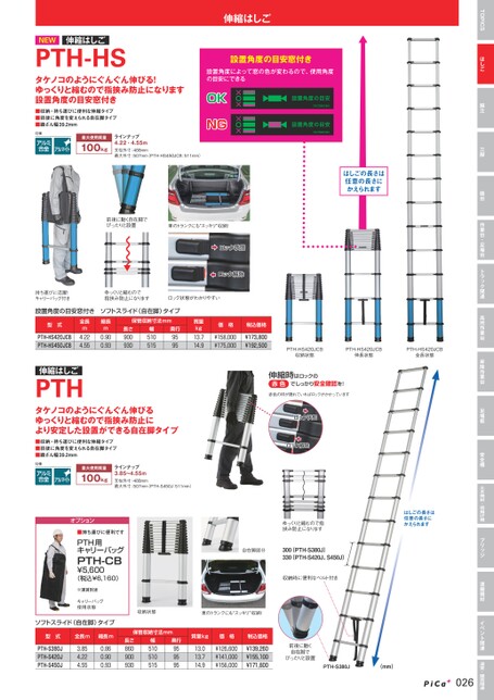 TOPICSはしご脚立三脚踏台作業台・足場台トラック関連高所作業台昇降作業台足場板安全柵土木機材・荷揚げ機ブリッジ運搬機材イベント関連温室・園芸関連PTH-HS420JCB収納状態PTH-HS420JCB伸長状態PTH-HS420JCB全長状態伸縮時はロックの赤色でしっかり安全確認を!赤色の印が隠れていればロックがかかっていますはしごの長さは任意の長さにかえられますロック状態ロック解除◀ゆっくりと縮むので指挟み防止になります▶◀300(PTH-S380J)330(PTH-S420J、S450J)収納時に便利なベルト付き自在脚部分前後に動く自在脚でぴったりと設置車のトランクにも“スッキリ”収納!ロック状態ロック解除持ち運びに活躍!キャリーバッグ付きゆっくりと縮むので指挟み防止になりますロック状態がわかりやすい設置角度の目安窓付きソフトスライド(自在脚)タイプ型式PTH-HS420JCBPTH-HS450JCB全長m4.224.55縮長m0.900.93保管収納寸法mm長さ900930幅510515奥行9595質量kg13.714.9価格¥158,000¥175,000税込価格¥173,800¥192,500伸縮はしごPTHタケノコのようにぐんぐん伸びるゆっくりと縮むので指挟み防止により安定した設置ができる自在脚タイプ■収納・持ち運びに便利な伸縮タイプ■前後に角度を変えられる自在脚タイプ■踏ざん幅39.2mm仕様AE最大使用質量100kgラインナップ3.85〜4.55m支柱外寸:488mm最大外寸:507mm(PTH-S450J:511mm)オプション■持ち運びに便利ですPTH用キャリーバッグPTH-CB¥5,600(税込¥6,160)※運賃別途キャリーバッグ使用状態収納状態車のトランクにも“スッキリ”収納!ソフトスライド(自在脚)タイプ型式全長m縮長mPTH-S380JPTH-S420JPTH-S450J3.854.224.550.860.900.93保管収納寸法mm長さ860900930幅510510515奥行959595質量kg価格13.013.714.9¥126,600¥141,000¥156,000税込価格¥139,260¥155,100¥171,600前後に動く自在脚でぴったりと設置PTH-S380J(mm)026NEW 伸縮はしごPTH-HSタケノコのようにぐんぐん伸びる!ゆっくりと縮むので指挟み防止になります設置角度の目安窓付き■収納・持ち運びに便利な伸縮タイプ■前後に角度を変えられる自在脚タイプ■踏ざん幅39.2mm仕様AE最大使用質量100kgラインナップ4.22 ・ 4.55m支柱外寸:488mm最大外寸:507mm(PTH-HS450JCB:511mm)伸縮はしご設置角度の目安窓付き設置角度によって窓の色が変わるので、使用角度の目安にできるOKNGはしごの長さは任意の長さにかえられます