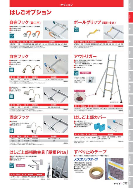 TOPICSはしご脚立三脚踏台作業台・足場台トラック関連高所作業台昇降作業台足場板安全柵土木機材・荷揚げ機ブリッジ運搬機材イベント関連温室・園芸関連オプションはしごオプション自在フック(電工用)■内側取付時、フックを回転させて収めることができます■フック内径75mm■左右各1個/セット仕様Dポールグリップ(電柱支え)仕様A型式LP-F1A質量kg1.0価格¥37,600税込価格¥41,360適合機種LNT・ALF・LLW・LLS・PRO・JOB・CSM・SWJ・LYS・2JR※はしごに取付け穴をあける必要があります※LNTは穴あけ加工済です※取付け位置によっては、はしごを最後まで縮めることができない場合があります※運賃別途型式LP-G1A質量kg0.4価格¥23,000税込価格¥25,300※はしごに取付け穴をあける必要があります※LNT、LGPは穴あけ加工済です適合機種LNT・ALF・PRO・JOB・CSM・SWA・LYS・LGP・2JR※運賃別途自在フック■内側取付時、フックを回転させて収めることができます■フック内径90mm■左右各1個/セット仕様C適合機種LNT・ALF・LLW・LLS・PRO・SWJ※運賃別途質量kg0.8型式F-UJ価格¥14,000※はしごに取付け穴をあける必要があります※取付け位置によっては、はしごを最後まで縮めることができない場合があります税込価格¥15,400■内側取付時、フックを回転させて収めることができます■フック内径70mm■左右各1個/セット仕様Cアウトリガー■はしご使用時に左右方向の安定性がアップします■取付けたまま収納ができ、アウトリガーの開閉は伸縮レバーでワンタッチ操作■自在に動くドームジョイント採用■左右各1個/セット仕様A特許登録済アウトリガーは伸縮レバーを押すだけで開閉でき、4mmピッチで長さ調整ができますドームジョイント型式F-AJ2質量kg0.9価格¥15,600税込価格¥17,160※取付けはノブ式(取付け穴をあける必要はありません)※2連、3連はしごに取付ける際は、はしごを最後まで縮めることができません適合機種JOB・CSM・LYS・2JR※運賃別途型式LP-AUS2質量kg4.6価格¥55,000税込価格¥60,500※はしごに取付け穴をあける必要がありますはしご取付け例適合機種SWA1連)・ALF・PRO・JOB・CSM・LLS・2JR※運賃別途固定フック■フック内径F-AK2:70mmF-CK3:40mm■左右各1個/セット仕様C型式F-AK2F-CK3質量kg0.80.6価格¥11,600¥10,600税込価格¥12,760¥11,660※取付けはノブ式(取付け穴をあける必要はありません)※2連、3連はしごに取付ける際は、はしごを最後まで縮めることができません適合機種JOB・CSM・LYS・2JRSWA※運賃別途はしご上部カバー■左右各1個/セット■はしごの上部に取付けることで、壁面を傷付きから保護します■取付け確認用マド付き型式質量kg価格税込価格適合機種LP-TC0.32¥7,600¥8,360ALF(※3ALF-130、150は除く)・PRO・JOB・CSM・LYS・2JR※使用時以外は取外してください。輸送中に外れる恐れがあります※材質:発泡ウレタン※運賃別途はしご上部補助金具「屋根Pita」■雨どいや瓦に傷をつけずにはしごを設置できます■使用しない時は収納できます■左右各1個/セットすべり止めテープ■はしごの踏ざん・階段などに貼るだけでスリップ事故の防止に仕様A特許登録済型式LP-YP質量kg0.8価格¥31,000税込価格¥34,100適合機種JOB・CSM・LYS・2JR※はしごに取付け穴をあける必要があります※運賃別途収納時使用例PNT-253Y(一般屋外用)¥2,600(税込¥2,860)●サイズ/25mm×3m●裏地素材/アルミ※20巻単位未満のご注文は運賃別途使用例032