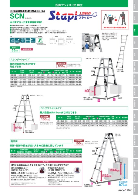 TOPICSはしご脚立三脚踏台作業台・足場台トラック関連高所作業台昇降作業台足場板安全柵土木機材・荷揚げ機ブリッジ運搬機材イベント関連温室・園芸関連伸縮操作バーの端を引き上げれば1脚、真ん中を引き上げれば2脚同時に伸縮両手で操作すれば4脚同時に伸縮も可能四脚アジャスト式脚立四脚アジャスト式はしご兼用脚立SCNスタッピーかがまず立ったまま脚伸縮可能!■最大段差が約31cmまで対応できる上部操作タイプ■踏ざん内の伸縮操作バーを引き上げるだけで簡単に伸縮できます■状況に応じて上部/下部でのワンタッチ伸縮操作が可能です■滑り止めキャップの材質に*エラストマーを採用*エラストマー焼却しても有毒ガスが発生しない材質です■四脚すべて6mmピッチで脚の長さが調節でき、段差がある場所でもフラットな足場が確保できます(mm)SCN-80B、210BSCN-20LB、150LB、180LBSCN-4B、45B2726.5SCN-90B〜150B支柱形状4849踏ざん形状55.3T※SCN-90B、SCN-LB、SCN-34B、45Bは対象外仕様認定規格天板寸法/303×172▶305◀◀約44cm▶SCN-180LB(段差設置状態)ロングスライドタイプ最大段差が約44cmまで対応できる最大使用質量100kg天板の高さ:0.94〜1.97mはしごの長さ:2.02〜4.17m型式天板の高さmSCN-120LBSCN-150LBSCN-180LB0.94〜1.391.24〜1.681.53〜1.97※最大時約1.5尺伸縮可能はしごの長さm2.02〜2.952.63〜3.563.24〜4.17◀約31cmSCN-120B(段差設置状態)▶◀▶◀DW▶(mm)設置寸法mmW昇降面489〜571543〜624596〜678奥行D748〜1021927〜11991105〜1378保管収納寸法mm長さ103513401645幅490545600奥行170170170質量kg8.59.510.8価格税込価格¥48,000¥56,000¥62,000¥52,800¥61,600¥68,200天板寸法/303×172階段用前脚・後脚の長さが違い大きめの段差に適しています最大使用質量100kg天板の高さ:1.24〜1.97mはしごの長さ:2.32〜3.87m型式SCN-34BSCN-45B天板の高さm階段使用時1.24〜1.681.53〜1.97平地使用時1.24〜1.391.53〜1.68はしごの長さm2.32〜3.262.93〜3.87設置寸法mmW昇降面543〜624596〜678奥行D837〜11101016〜1288保管収納寸法mm奥行長さ17013401645170幅545600質量kg9.010.2価格税込価格¥52,600¥60,000¥57,860¥66,000オプション滑り止め端具ユニットを交換することで、自在脚仕様に変更できます滑り止め端具ユニット(自在脚・丸型タイプ)SCLJA-PS1(2個/セット)¥6,000(税込¥6,600)※運賃別途端具にテンションがかかり、角度が固定できるタイプ適合機種:SXJ、SCN、SCL-90A〜360A滑り止め端具ユニット(自在脚・角型タイプ)SCMJ-PS2(2個/セット)¥6,000(税込¥6,600)※運賃別途端具角度が固定されないフリータイプ適合機種:SXJ、SCN、SCL-A※ロングスライドタイプ、階段用に取付ける場合は、脚立に取付け穴をあける必要があります※脚立1台分は2セット必要です※ロングスライドタイプ、階段用には取付けられません※脚立1台分は2セット必要です▶305◀◀◀約44cm◀約44cm◀W▶▶◀(mm)SCN-45B(段差設置状態)D▶▶最大高低差▶約74cm040AELKJ※支柱のみ幅広踏ざん55mm特許登録済スタンダードタイプ最大段差が約31cmまで対応できる型式SCN-90BSCN-120BSCN-150BSCN-180BSCN-210B天板の高さm0.66〜0.970.94〜1.251.24〜1.551.53〜1.841.82〜2.13はしごの長さm1.43〜2.072.02〜2.662.63〜3.273.24〜3.883.85〜4.49※最大時約1尺伸縮可能天板寸法/303×172▶305◀最大使用質量100kg天板の高さ:0.66〜2.13mはしごの長さ:1.43〜4.49m保管収納寸法mm奥行長さ1707401035170170134017016451950170幅440490545600650質量kg6.47.18.210.011.2価格税込価格¥36,000¥41,600¥46,600¥54,000¥60,000¥39,600¥45,760¥51,260¥59,400¥66,000SCN-150B(はしご状態)設置寸法mmW昇降面437〜494489〜546543〜599596〜652649〜706奥行D575〜764748〜937927〜11151105〜12941283〜1472