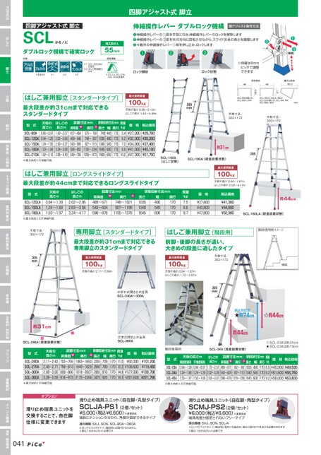 ◀▶約44cmSCL-180LA(段差設置状態)階段使用時イメージ横面天板寸法/303×172▶305mm◀◀▶◀◀最大高低差★約74cm☆約44cm約44cm▶▶四脚アジャスト式脚立SCLかるノビダブルロック機構で確実ロック仕様四脚アジャスト式脚立伸縮操作レバーダブルロック機構脚アジャスト操作方法❶伸縮操作レバーの①部を手前に引き、伸縮操作レバーのロックを解除します❷伸縮操作レバーの2部を矢印方向に回転させながら、スライド支柱の長さを調整します❸4箇所の伸縮操作レバー①部を押し込み、ロックします❷●●●❶❸伸縮幅広踏ざん55mm認定規格支柱形状4849踏ざん形状55.3SCL-23Aの短い方SCL-240A、270ASCL-120LA、150LA、180LASCL-23Aの長い方、SCL-34A、45ASCL-300A、360A(mm)2726.5☆伸縮は6mmピッチで調整できます天板寸法/303×172天板寸法/303×172AELKJ※1SCL-360Aは交差式※2はしご兼用脚立のみ※支柱のみ※1※2※2T※SCL-LA、SCL-23A、34A、45Aは対象外ロック解除ロック状態はしご兼用脚立[スタンダードタイプ]最大段差が約31cmまで対応できるスタンダードタイプ最大使用質量100kg天板の高さ:0.66〜2.13mはしごの長さ:1.43〜4.49m▶305mm◀型式天板の高さm0.66〜0.970.94〜1.251.24〜1.551.53〜1.841.82〜2.13※最大時約1尺伸縮可能SCL-90ASCL-120ASCL-150ASCL-180ASCL-210Aはしごの長さm1.43〜2.072.02〜2.662.63〜3.273.24〜3.883.85〜4.49D設置寸法mm奥行764575〜748〜937927〜11151105〜12941283〜1472W昇降面437〜494489〜546543〜599596〜652649〜706保管収納寸法mm長さ奥行1707401701035170134017016451950170幅440490545600650質量kg5.46.27.28.910.0価格税込価格¥27,000¥32,000¥34,000¥41,000¥47,000¥29,700¥35,200¥37,400¥45,100¥51,700はしご兼用脚立[ロングスライドタイプ]最大段差が約44cmまで対応できるロングスライドタイプ◀▶約31cmSCL-180A(段差設置状態)▶305◀SCL-150A(はしご状態)最大使用質量100kg天板の高さ:0.94〜1.97mはしごの長さ:2.02〜4.17m型式SCL-120LASCL-150LASCL-180LA天板の高さm0.94〜1.391.24〜1.681.53〜1.97はしごの長さm2.02〜2.952.63〜3.563.24〜4.17※最大時約1.5尺伸縮可能設置寸法mmW奥行D748〜1021927〜11991105〜1378昇降面489〜571543〜624596〜678保管収納寸法mm長さ103513401645幅490545600奥行170170170質量kg7.58.69.7価格¥37,600¥40,600¥47,600税込価格¥41,360¥44,660¥52,360専用脚立[スタンダードタイプ]最大段差が約31cmまで対応できる専用脚立のスタンダードタイプはしご兼用脚立[階段用]前脚・後脚の長さが違い、大きめの段差に適したタイプ最大使用質量100kg天板の高さ:2.11〜3.59m最大使用質量100kg天板の高さ:0.94〜1.97mはしごの長さ:1.72〜3.87m天板寸法/303×172▶305mm◀約31cm◀▶◀W▶D▶◀設置寸法mm奥行WD昇降面702〜759756〜813809〜866916〜9731463〜16501640〜18291818〜20072175〜2364SCL-240A(段差設置状態)型式SCL-240ASCL-270ASCL-300ASCL-360A天板の高さm2.11〜2.422.40〜2.712.69〜3.003.28〜3.59※最大時約1尺伸縮可能オプション滑り止め端具ユニットを交換することで、自在脚仕様に変更できます041中折れ式開き止め金具SCL-240A〜300A交差式開き止め金具SCL-360A保管収納寸法mm質量kg長さ11.02255256012.314.92865347519.3奥行170170170170幅705760810925価格税込価格¥92,000¥108,600¥127,000¥201,600¥101,200¥119,460¥139,700¥221,760☆SCL-23Aは約31cm★SCL-23Aは約73cm階段使用例SCL-34A(段差設置状態)型式SCL-23ASCL-34ASCL-45A天板の高さm階段使用時0.94〜1.391.24〜1.681.53〜1.97平地使用時0.94〜0.971.24〜1.391.53〜1.68はしごの長さm1.72〜2.512.32〜3.262.93〜3.87※最大時約1.5尺伸縮可能設置寸法mmW昇降面489〜571543〜624596〜678D奥行892662〜837〜11101016〜1288保管収納寸法mm奥行長さ103517017013401645170幅490545600質量kg6.58.29.2価格税込価格¥45,000¥51,600¥58,000¥49,500¥56,760¥63,800滑り止め端具ユニット(自在脚・丸型タイプ)SCLJA-PS1(2個/セット)¥6,000(税込¥6,600)※運賃別途端具にテンションがかかり、角度が固定できるタイプ適合機種:SXJ、SCN、SCL-90A〜360A※ロングスライドタイプ、階段用には取付けられません※脚立1台分は2セット必要です滑り止め端具ユニット(自在脚・角型タイプ)SCMJ-PS2(2個/セット)¥6,000(税込¥6,600)※運賃別途端具角度が固定されないフリータイプ適合機種:SXJ、SCN、SCL-A※ロングスライドタイプ、階段用に取付ける場合は、脚立に取付け穴をあける必要があります※脚立1台分は2セット必要ですTOPICSはしご脚立三脚踏台作業台・足場台トラック関連高所作業台昇降作業台足場板安全柵土木機材・荷揚げ機ブリッジ運搬機材イベント関連温室・園芸関連