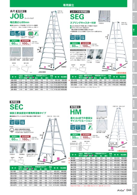 TOPICSはしご脚立三脚踏台作業台・足場台トラック関連高所作業台昇降作業台足場板安全柵土木機材・荷揚げ機ブリッジ運搬機材イベント関連温室・園芸関連天板寸法/330×536D▶(mm)▶◀★受注生産品■上わく付きなので天板に乗って作業ができます■スプリングキャスター付きなので脚立状態のまま移動が容易に行えます※収納状態(たたんだ状態)ではキャスターは使えません仕様ALM幅広踏ざん60mm最大使用質量100kg天板の高さ:1.80〜3.00m▶314◀人がのっていない状態人がのっている状態▶260◀W◀SEG-A240スプリングキャスターの特長キャスター上部のスプリングにより、人がのると自動的に滑り止めキャップが接地して安定します。未使用時には浮き上がり、楽に移動ができます。支柱形状65踏ざん形状6026▶D(mm)天板寸法/300×172上わく付き専用脚立SEGスプリングキャスター付き天板部分専用脚立(mm)★型式SEG-A180SEG-A240SEG-A300天板の高さm1.802.403.00設置寸法mmD奥行164920162382W昇降面8369351034保管収納寸法mm長さ247531003730幅8409401040奥行230230230質量kg19.124.829.2価格税込価格¥265,000¥371,000¥440,600¥291,500¥408,100¥484,660天板寸法/300×247▶305◀196(C60)▶200(C90〜C420)◀◀WHM-C360▶◀D▶(mm)★受注生産品価格税込価格¥60,000¥65,000¥74,000¥81,000¥96,600¥128,600¥150,000¥176,000¥222,000¥260,000¥305,000¥354,000¥66,000¥71,500¥81,400¥89,100¥106,260¥141,460¥165,000¥193,600¥244,200¥286,000¥335,500¥389,400044※本体の垂直高さは天板の高さ+上わくの高さ(56.4cm)です専用脚立HM最大4mまでの豊富なサイズバリエーション仕様ALM※C360〜C420は交差式です認定規格T中折れ式開き止め金具HM-C60〜C300交差式開き止め金具HM-C360〜C420天板の高さm0.540.831.121.411.701.992.292.582.873.453.744.04D設置寸法mm奥行585763942112012991477165518342012236925472726W昇降面41747052457763168473879184595110051058保管収納寸法mm長さ6259251230153018352140244527503055366539704275幅42047552558063568574079585095510101060奥行250255255255255255255255255255255255質量kg3.54.45.36.27.28.69.911.113.320.322.224.4天板の高さ:0.54〜4.04m最大使用質量100kg踏ざん形状55(mm)24.3(HM-C300〜C420)24.1(HM-C210〜C270)24(HM-C60〜C180)幅広踏ざん55mm支柱形状48.6(HM‐C60〜C270)49(HM‐C300〜C420)型式HM-C60HM-C90HM-C120HM-C150HM-C180HM-C210HM-C240HM-C270HM-C300HM-C360HM-C390HM-C420★★★※ 品の長さや地域により、お届けが困難な場合があります。都度お問い合わせください▶◀▶◀186W◀JOB-360E(mm)24中折れ式開き止め金具JOB-240E〜300E交差式開き止め金具JOB-330E、360E支柱形状49踏ざん形状60幅広踏ざん60mm最大使用質量100kg天板の高さ:2.27〜3.43m▶305◀■滑り止めキャップの材質に*エラストマーを採用*エラストマー焼却しても有毒ガスが発生しない材質です仕様認定規格AEL※支柱のみ※330E、360Eは交差式ですT※300E〜360EはSG対象外長尺専用脚立JOBスーパージョブ幅広踏ざん60mm型式JOB-240EJOB-270EJOB-300EJOB-330EJOB-360E天板の高さm2.272.562.853.143.43W昇降面設置寸法mmD奥行15751753193121102289731784838891945保管収納寸法mm長さ24202725303033353640幅735785840895950奥行170170170170170質量kg10.211.813.215.017.0価格税込価格¥90,000¥106,000¥124,600¥165,600¥190,600¥99,000¥116,600¥137,060¥182,160¥209,660専用脚立SEC仮設工業会認定の業務用溶接タイプ■収納時はフラットになるので積み重ねて保管できます天板寸法/320×160仕様ALM認定規格U仮設工業会認定合格品※SEC-S210〜S270は対象外※特注製作の場合、仮設認定外となります幅広踏ざん60mm最大使用質量160kg天板の高さ:0.90〜2.70m▶314◀D▶(mm)▶◀収納時の横ズレ防止滑り止めキャップ▶260W◀◀SEC-S180(mm)天板部分溶接構造支柱形状65踏ざん形状6026型式SEC-S90SEC-S120SEC-S150SEC-S180SEC-S210SEC-S240SEC-S270天板の高さm0.901.201.501.802.102.402.70D設置寸法mm奥行71689910831266145016331817W昇降面532598664730796862928保管収納寸法mm長さ1000131016201940225025602880幅535600665730800865930奥行180180180180180180180質量kg6.17.69.711.613.716.718.3価格税込価格¥80,000¥95,000¥108,000¥126,600¥157,600¥189,000¥216,600¥88,000¥104,500¥118,800¥139,260¥173,360¥207,900¥238,260