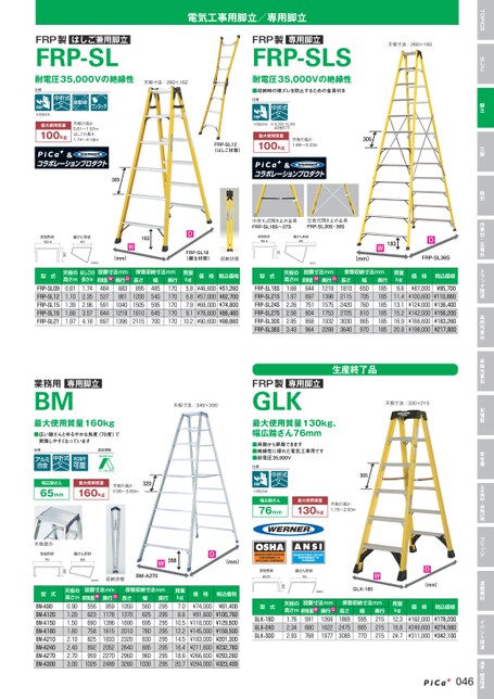 TOPICSはしご脚立三脚踏台作業台・足場台トラック関連高所作業台昇降作業台足場板安全柵土木機材・荷揚げ機ブリッジ運搬機材イベント関連温室・園芸関連電気工事用脚立/専用脚立天板寸法/260×165FRP製専用脚立FRP-SLS耐電圧35,000Vの絶縁性■収納時の横ズレを防止するための金具付き仕様▶305◀BL※支柱のみ※SL30S、SL36Sは交差式ですFRP-SL12(はしご状態)最大使用質量100kg天板の高さ:1.68〜3.43m▶D中折れ式開き止め金具FRP-SL18S〜27S交差式開き止め金具FRP-SL30S・36S支柱形状52.4踏ざん形状60W◀(mm)保管収納寸法mm長さ181021152420272530303640幅650705760810865970奥行185185185185185185183▶◀D▶▶◀FRP-SL36S質量kg9.811.413.115.216.920.8価格税込価格¥87,000¥100,600¥124,000¥142,000¥166,600¥198,000¥95,700¥110,660¥136,400¥156,200¥183,260¥217,800(mm)30▶◀FRP-SL18(脚立状態)収納状態型式FRP-SL09FRP-SL12FRP-SL15FRP-SL18FRP-SL21天板の高さm0.811.101.391.681.97はしごの長さm1.742.352.963.574.18設置寸法mmDW昇降面奥行683861104012181396484537591644697保管収納寸法mm奥行長さ1708951701200170150518101701702115幅485540595645700質量kg5.86.87.99.110.2価格税込価格型式¥46,600¥57,000¥68,000¥78,600¥90,600¥51,260¥62,700¥74,800¥86,460¥99,660FRP-SL18SFRP-SL21SFRP-SL24SFRP-SL27SFRP-SL30SFRP-SL36S天板の高さm1.681.972.262.562.853.43D設置寸法mmW奥行昇降面121813961575175319322288644697751804858964▶D▶◀(mm)◀WGLK-180(mm)29支柱形状80.5踏ざん形状76■両側から昇降できます■絶縁性に優れた電気工事用です■耐電圧35,000V仕様BL※支柱のみ幅広踏ざん76mm最大使用質量130kg天板の高さ:1.76〜2.93m▶305◀型式GLK-180GLK-240GLK-300天板の高さm1.762.342.93W昇降面設置寸法mmD奥行126816221977591680768保管収納寸法mm長さ186524753085幅595685770奥行215215215質量kg12.316.824.7価格税込価格¥162,000¥249,600¥311,000¥178,200¥274,560¥342,100046生産終了品天板寸法/330×215FRP製専用脚立GLK最大使用質量130kg、幅広踏ざん76mm業務用専用脚立BM最大使用質量160kg■広い踏ざんとゆるやかな角度(70度)で昇降しやすくなっています仕様ALM認定規格T幅広踏ざん65mm最大使用質量160kg天板の高さ:0.90〜3.00m天板寸法/349×300▶320◀W◀BM-A270▶268◀▶◀D▶(mm)(mm)収納状態踏ざん形状6525天板部分支柱形状70型式BM-A90BM-A120BM-A150BM-A180BM-A210BM-A240BM-A270BM-A300天板の高さm0.901.201.501.802.102.402.703.00D設置寸法mm奥行9591178139616151833205222702489W昇降面5566236907588258929591026保管収納寸法mm長さ10501370169020102320264029603280幅5606256957608308959601030奥行295295295295295295295295質量kg7.08.610.512.214.516.418.620.7価格税込価格¥74,000¥91,600¥118,000¥145,000¥183,000¥211,600¥266,600¥294,000¥81,400¥100,760¥129,800¥159,500¥201,300¥232,760¥293,260¥323,400FRP製はしご兼用脚立FRP-SL耐電圧35,000Vの絶縁性天板寸法/260×162仕様BLKJ※支柱のみ最大使用質量100kg天板の高さ:0.81〜1.97mはしごの長さ:1.74〜4.18m▶305◀▶183◀W◀(mm)(mm)30支柱形状52.4踏ざん形状43