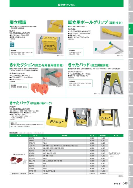 TOPICSはしご脚立三脚踏台作業台・足場台トラック関連高所作業台昇降作業台足場板安全柵土木機材・荷揚げ機ブリッジ運搬機材イベント関連温室・園芸関連脚立標識■天板に乗る、またがるなどの誤った使用方法の危険性を警告する標識SLP-K¥4,600(税込¥5,060)●サイズ(mm)/700×230●材質/ポリ塩化ビニル※運賃別途仕様M適合機種JOB・NDA・PRO・MCX・SEC・LM・FRP・SXJ・SCN・SCL脚立オプション脚立用ポールグリップ(電柱支え)■はしご状態で使用する電柱支えSLP-GA¥19,000(税込¥20,900)●サイズ(mm)/225×49.5×47●質量(kg)/0.3●材質/エチレンプロピレンゴム※運賃別途適合機種JOB-60E〜120E、NDA-90〜120取付イメージ取付イメージきゃたクション(脚立・足場台用緩衝材)■脚立や足場台が転倒・接触した時の衝撃を吸収し、フローリングやクロスなどへのダメージを軽減しますSLP-KC(2個/セット)¥4,000(税込¥4,400)●サイズ(mm)/113×108×40●材質/ポリエチレン※運賃別途適合機種兼用脚立・専用脚立・足場台きゃたバッグ(脚立用小物バッグ)PKB-Y¥5,600(税込¥6,160)●サイズ(mm)/250×160×100(ベルト除く)●最大使用質量/2kg●質量(kg)/0.18●材質/本体:ポリエステルベルト:ポリエチレンテレフタレートバックル:ポリアセタール※運賃別途適合サイズ通常の天板形状(例:LM等)で天板寸法が正面幅:300mm×奥行:152〜184mmサイズの脚立きゃたパッド(脚立用緩衝材)■脚立が転倒・接触した時の衝撃を吸収し、フローリングやクロスなどへのダメージを軽減しますSLP-KP(2個/セット)¥10,600(税込¥11,660)●材質/ナイロン・ポリウレタン※運賃別途適合機種JOB・NDA・PRO・MCX・FRP・LM・SXJ・SCN・SCL取付イメージ取付イメージ使用イメージ取付イメージ脚立部品表※部品には取付に必要なボルトナット等が付属しています名称型式適合機種SXJ-PS1LM-PS1PROB-PS1JOBE-PS1JOBE-PS2MCX-PS1MCX-PS2SCN-PS1SCLA-PS1SCLA-PS2AM-PS1SEC-PS1SEG-PS1FRPSL-PS1SWK-P2SXJ-ALMPRO-BJOB-60E〜120E、NDA-90〜120、JOB-BGA90E〜BGA120EJOB-150E〜360E、NDA-150〜210MCX-60〜120HM-C、MCX-150〜210SCN-90B〜210BSCL-ASCL-LA、SCN-LB、SCN-34B・45BBM-ASEC-SSEG-AFRP-SL、FRP-SL*SJOB-BG滑り止めキャップSXJ-PS1巻き付けベルトセット価格¥4,000¥4,000¥4,000¥4,000¥4,000¥3,000¥3,000¥4,000¥4,000¥4,000¥4,000¥4,000¥4,000¥4,000¥14,000税込価格¥4,400¥4,400¥4,400¥4,400¥4,400¥3,300¥3,300¥4,400¥4,400¥4,400¥4,400¥4,400¥4,400¥4,400¥15,400備考左右各1個/セット※脚立1台分は2セット必要です※運賃別途048
