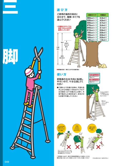 開き止め(チェーン等)を必ずかけてください三脚のタイプ360cmタイプ330cmタイプ300cmタイプ270cmタイプ240cmタイプ210cmタイプ180cmタイプ150cmタイプ120cmタイプ90cmタイプ作業高さ4.3mまで4.0mまで3.7mまで3.4mまで3.1mまで2.8mまで2.8mまで2.5mまで2.2mまで1.9mまで選び方ご使用の場所の高さに合わせて、種類・タイプを選んでください※作業高さのサイズは、身長160cmの方を基準にしています身長身体をささえる部分作業高さ使用最大高さ●使用最大高さ:乗ることができる最大高さ使い方昇降面の左右方向に転倒しやすいので、十分注意してください●三脚の上で作業する時は、天板を含め上から4段目(180㎝タイプ以下は3段目)以下の踏ざんに乗り、天板や踏ざんに身体を当て、安定させた状態で作業してください210cmタイプ以上の三脚乗ることができるのは上から4段目以下です180cmタイプ以下の三脚乗ることができるのは上から3段目以下です2m以上の高所での作業時はヘルメットと安全帯を着用してください三脚75゜75゜水平な面三脚から身体を乗り出すこと禁止木の枝や物を無理に押したり引いたりすること禁止天板にのらないすわらないまたがらない049チェーンソーやトリマーなど身体の安定がえられない道具は使用しないでくださいご使用前には必ず、添付の取扱説明書をよくお読みいただき、事故が起こらないよう、内容にしたがって正しくお使いくださいⒸ軽金属製品協会(無断転用禁止)