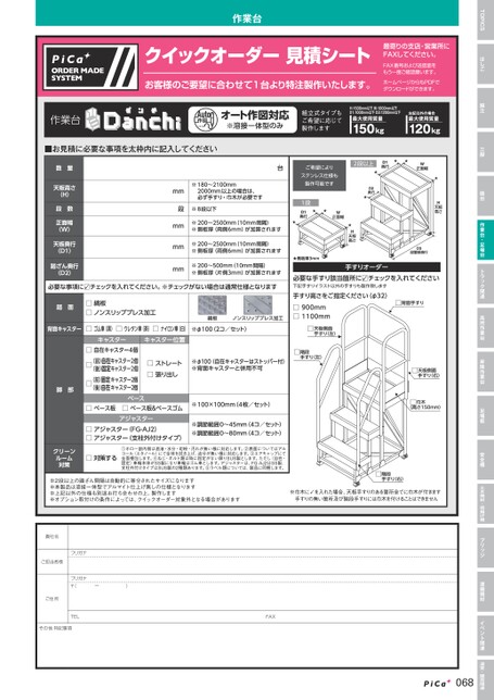 TOPICSはしご脚立三脚踏台作業台・足場台トラック関連高所作業台昇降作業台足場板安全柵土木機材・荷揚げ機ブリッジ運搬機材イベント関連温室・園芸関連068作業台クイックオーダー見積シート最寄りの支店・営業所にFAXしてください。FAX番号および送信面をもう一度ご確認願います。お客様のご要望に合わせて1台より特注製作いたします。ホームページからもPDFでダウンロードができます。貴社名フリガナご担当者様フリガナ〒(ー)ご住 所TELその他 特記事項FAX