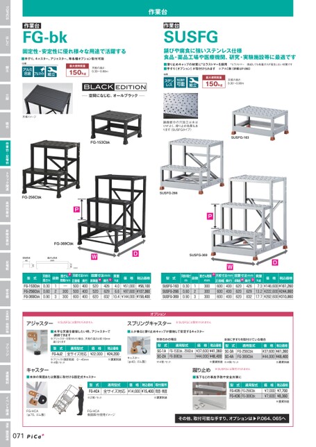 作業台作業台SUSFG錆びや腐食に強いステンレス仕様食品・薬品工場や医療機関、研究・実験施設等に最適です■滑り止めキャップの材質に*エラストマーを採用*エラストマー焼却しても有毒ガスが発生しない材質です■手すり(オプション)が取付けられます※アルミ製(詳細はP.065)仕様DMF最大使用質量150kg天板の高さ:0.30〜0.90m作業台FG-bk固定性・安定性に優れ様々な用途で活躍する■手すり、キャスター、アジャスター、等各種オプション取付可能仕様AEF最大使用質量150kg天板の高さ:0.30〜0.90m─空間になじむ、オールブラック─天板イメージ踏面部分の穴加工は水はけがよく、滑り止め効果もあります(SUSFGタイプ)SUSFG-163FG-153CbkSUSFG-266P▶◀▶W◀▶DSUSFG-369◀W◀▶D▶設置寸法mmDW昇降面奥行426629832520520620質量kg4.06.610.4価格税込価格¥51,000¥97,600¥144,000¥56,100¥107,360¥158,400型式SUSFG-163SUSFG-266SUSFG-369天板の高さm0.300.600.90123段数踏ざん間隔P天板寸法mm設置寸法mmD奥行正面幅奥行426400600629400600600400832W昇降面620620620質量kg7.313.217.7価格税込価格¥146,600¥222,600¥282,600¥161,260¥244,860¥310,860mm300300300FG-256CbkP▶◀FG-369Cbk◀型式FG-153CbkFG-256CbkFG-369Cbk天板の高さm0.300.600.90段数P踏ざん間隔mm123―300300天板寸法mm正面幅奥行400500400500600400(mm)352踏ざん形状20026支柱形状40アジャスター※SUSFGには取付けられません■水平な天板を確保したい時、アジャスターで※アジャスターを取付けた場合、天板の高さは約16mm調節できます高くなりますオプションスプリングキャスター※SUSFGには取付けられません■人が乗ると滑り止めキャップが接地して安定するキャスター型式FG-AJ2適用型式全サイズ対応価格¥22,000※アジャスト調節範囲0〜45mm※4個/セット税込価格¥24,200※運賃別途キャスター(φ40、ゴム製)キャスター■本体の背面または側面に取付ける固定式キャスター型式FG-HCA適用型式全サイズ対応価格¥14,000税込価格¥15,400※2個/セットFG-HCA側面取付使用イメージFG-HCA(φ75、ゴム製)071※4個/セット取付箇所背面・側面※運賃別途本体のみの場合型式SC-1ASC-2A適用型式FG-153Cbk、256CbkFG-369Cbk価格¥37,600¥44,000税込価格¥41,360¥48,400※運賃別途本体に手すりを取付けている場合型式SC-3ASC-4AFG-256CbkFG-369Cbk適用型式価格¥37,600¥44,000※4個/セット税込価格¥41,360¥48,400※運賃別途蹴り止め※SUSFGには取付けられません■落下などの事故予防や安全対策に取付例型式FG-KD5FG-KD6適用型式FG-256CbkFG-369Cbk価格¥7,000¥7,600税込価格¥7,700¥8,360※運賃別途その他、取付可能な手すり、オプションは▶P.064、065へTOPICSはしご脚立三脚踏台作業台・足場台トラック関連高所作業台昇降作業台足場板安全柵土木機材・荷揚げ機ブリッジ運搬機材イベント関連温室・園芸関連