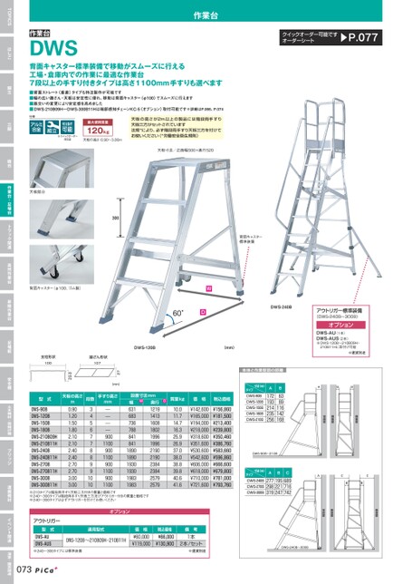 作業台クイックオーダー可能ですオーダーシート▶P.077作業台DWS背面キャスター標準装備で移動がスムーズに行える工場・倉庫内での作業に最適な作業台7段以上の手すり付きタイプは高さ1100mm手すりも選べます■背面ストレート(垂直)タイプも特注製作が可能です■幅の広い踏ざん・天板は安定性に優れ、移動は背面キャスター(φ100)でスムーズに行えます■筋交いの変更により安定感を高めました■DWS-210B09H〜DWS-300B11Hは端部感知チェーンKC-5(オプション)取付可能です※詳細はP.066、P.074仕様AFM※クイックオーダー対応品最大使用質量120kg天板の高さ:0.90〜3.00m天板の高さが2m以上の製品には階段両手すり天板三方がセットされています法規*により、必ず階段両手すり天板三方を付けてお使いください(*労働安全衛生規則)天板寸法/正面幅500×奥行520アウトリガー標準装備(DWS-240B〜300B)オプションDWS-AU(1本)DWS-AUS(2本)※DWS-120B〜210B09H・210B11Hに取付け可能※運賃別途側面壁側面壁背面壁ABB本体と作業壁面の距離タイプ寸法(㎜)DWS-90BDWS-120BDWS-150BDWS-180BDWS-210BA172193214235256B6389116142168背面キャスター標準装備◀W60°D▶▶DWS-240B◀DWS-120B(mm)天板部分▶300◀背面キャスター(φ100、ゴム製)支柱形状100踏ざん形状10727(mm)手すり高さmm————9001100900110090011009001100天板の高さm段数29.80.901.201.501.802.102.102.402.402.702.703.003.0034567788991010型式DWS-90BDWS-120BDWS-150BDWS-180BDWS-210B09HDWS-210B11HDWS-240BDWS-240B11HDWS-270BDWS-270B11HDWS-300BDWS-300B11HDWS‐90B〜210BDWSタイプ寸法(㎜)DWS-240BDWS-270BDWS-300BAB277298319195221247C689716742ACCBB側面壁側面壁背面壁側面壁側面壁背面壁オプションアウトリガー型式DWS-AUDWS-AUS適用型式DWS-120B〜210B09H・210B11H※240〜300タイプには標準装備価格¥60,000¥119,000DWS‐90B〜210B税込価格¥66,000¥130,900備考1本2本/セット※運賃別途DWS‐240B〜300B073※210タイプは階段両手すり天板三方付きの質量と価格です※240〜300タイプは階段両手すり天板三方及びアウトリガー付きの質量と価格です※240〜300タイプは必ずアウトリガーを付けてお使いください設置寸法mm幅W631683736788841841189018901930193019831983奥行121914131608180219961996219021902384238425792579質量kg価格税込価格D10.011.714.716.325.926.937.038.038.839.840.641.6¥142,600¥165,000¥194,000¥218,000¥318,600¥351,600¥530,600¥542,600¥606,000¥618,000¥710,000¥721,600A¥156,860¥181,500¥213,400¥239,800¥350,460¥386,760¥583,660¥596,860¥666,600¥679,800¥781,000¥793,760BBTOPICSはしご脚立三脚踏台作業台・足場台トラック関連高所作業台昇降作業台足場板安全柵土木機材・荷揚げ機ブリッジ運搬機材イベント関連温室・園芸関連