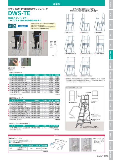 TOPICSはしご脚立三脚踏台作業台・足場台トラック関連高所作業台昇降作業台足場板安全柵土木機材・荷揚げ機ブリッジ運搬機材イベント関連温室・園芸関連①天板三方手すり★②階段片手すり③階段両手すり④階段両手すり天板三方★⑤階段片手すり天板三方★⑥天板二方手すり150(mm)手すり形状30巾木形状6.530◀900mm◀1100mm▶▶仕様AF意匠登録済天板の高さが2m以上の製品には階段両手すり天板三方がセットされています法規*により、必ず階段両手すり天板三方を付けてお使いください(*労働安全衛生規則)▶半割りソケットで手すりをしっかりと固定できますロック状態高さ900mmタイプ★⑦階段片手すり天板二方★⑧階段両手すり天板二方★階段手すり、天板側面手すりは左右どちらでも取付可能です。ただし、階段手すりを設置する場合には天板側面手すりまたはスタンション手すりも必要です※写真中の作業台は含まれません※写真は全て高さ900mmタイプですDWS-TE/各部名称・・・・・・◀・・・・・・・・・◀・・・・・・・90cm◀・・・・▶●天板側面手すり●天板背面手すり(巾木付)・◀・・・▶・・・・・・・・・・・●スタンション(天板二方手すり用)●DWS‐210B09H(本体)・・・・・・・・・・・・・・・※イラストはDWS‐210B09H(階段両手すり天板三方付き)です●階段手すり・・・適用型式DWS-90B〜180BDWS-90B〜180BDWS-90B〜180BDWS-90B〜180BDWS-90B〜180BDWS-90B〜180BDWS-90B〜180BDWS-90B〜180BDWS-90B〜180B適用型式DWS-90B〜180BDWS-90B〜180BDWS-90B〜180BDWS-90B〜180BDWS-90B〜180BDWS-90B〜180BDWS-90B〜180BDWS-90B〜180BDWS-90B〜180B質量kg6.33.46.88.37.34.75.77.30.7価格¥76,600¥45,000¥90,600¥87,600¥85,000¥67,000¥80,000¥82,600¥20,000税込価格¥84,260¥49,500¥99,660¥96,360¥93,500¥73,700¥88,000¥90,860¥22,000※運賃別途質量kg6.93.67.28.97.95.26.27.80.8価格¥92,000¥54,000¥105,000¥103,000¥100,600¥75,000¥95,000¥98,600¥25,000税込価格¥101,200¥59,400¥115,500¥113,300¥110,660¥82,500¥104,500¥108,460¥27,500※運賃別途適用型式DWS-90B〜180B質量kg0.5価格¥17,600税込価格¥19,360※運賃別途オプション名称型式DWS-TE1BDWS-TE2BDWS-TE3BDWS-TE4BDWS-TE5BDWS-TE8BDWS-TE9BDWS-TE10BDWS-TEP7B①②③④⑤⑥⑦⑧⑨※作業台は価格に含まれません天板三方手すり階段片手すり階段両手すり階段両手すり天板三方階段片手すり天板三方天板二方手すり階段片手すり天板二方階段両手すり天板二方スタンション(背面側)高さ1100mmタイプ名称型式DWS-TE1B11HDWS-TE2B11HDWS-TE3B11HDWS-TE4B11HDWS-TE5B11HDWS-TE8B11HDWS-TE9B11HDWS-TE10B11HDWS-TEP7B11H①②③④⑤⑥⑦⑧⑨※作業台は価格に含まれません天板三方手すり階段片手すり階段両手すり階段両手すり天板三方階段片手すり天板三方天板二方手すり階段片手すり天板二方階段両手すり天板二方スタンション(背面側)高さ900、1100mm共通タイプ★★★★★★★★★★型式DWS-TEP8B⑨※作業台は価格に含まれません名称スタンション(階段側)端部感知チェーン■作業可能エリアを認識できる端部感知チェーン■落下防止や進入禁止用に型式適用質量kg価格税込価格KC-5天板三方手すり、階段両手すり0.36¥14,000¥15,400※運賃別途※階段片手すり・天板二方手すり・階段片手すり天板二方には取付できません取付例074手すりDWS型作業台用オプションパーツDWS-TE豊富なラインナップでニーズに応えるDWS型作業台用手すり作業台手すりの高さは900mmタイプと1100mmタイプからお選びいただけます