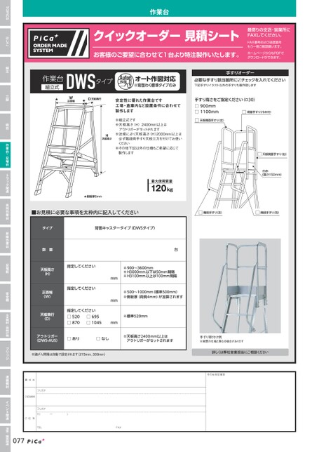 作業台クイックオーダー見積シート最寄りの支店・営業所にFAXしてください。FAX番号および送信面をもう一度ご確認願います。お客様のご要望に合わせて1台より特注製作いたします。ホームページからもPDFでダウンロードができます。その他 特記事項貴社名ご担当者様フリガナフリガナ〒(ー)ご住 所TEL077FAXTOPICSはしご脚立三脚踏台作業台・足場台トラック関連高所作業台昇降作業台足場板安全柵土木機材・荷揚げ機ブリッジ運搬機材イベント関連温室・園芸関連