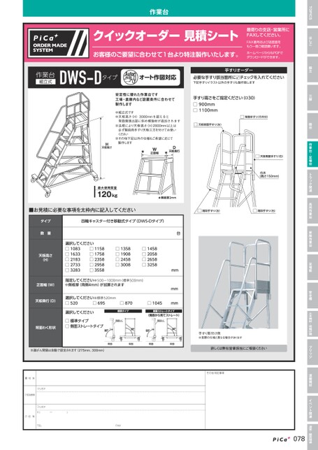 TOPICSはしご脚立三脚踏台作業台・足場台トラック関連高所作業台昇降作業台足場板安全柵土木機材・荷揚げ機ブリッジ運搬機材イベント関連温室・園芸関連078作業台クイックオーダー見積シート最寄りの支店・営業所にFAXしてください。FAX番号および送信面をもう一度ご確認願います。お客様のご要望に合わせて1台より特注製作いたします。ホームページからもPDFでダウンロードができます。作業台DWS-Dタイプ組立式最大使用質量120kg貴社名ご担当者様フリガナフリガナ〒(ー)ご住 所TELFAXその他 特記事項