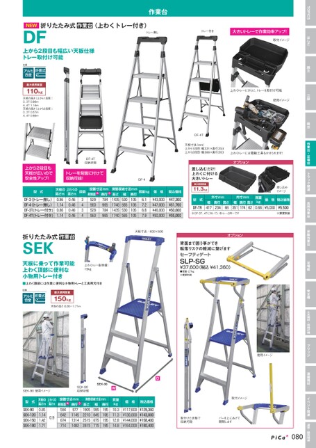TOPICSはしご脚立三脚踏台作業台・足場台トラック関連高所作業台昇降作業台足場板安全柵土木機材・荷揚げ機ブリッジ運搬機材イベント関連温室・園芸関連作業台トレー無しトレー付き大きいトレーで作業効率アップ!取付イメージ上わくトレーにさらに、トレーを取付け可能使用イメージDF-4T天板寸法(mm)上から1段目:幅331×奥行254上から2段目:幅366×奥行203差し込むだけ!上わくに付ける大きいトレー最大積載質量11.3kg上わくトレーには電動工具もかけられます!オプション差し込みイメージ型式DF-TR外寸mm内寸mm幅417奥行234高さ66幅351奥行高さ62174質量kg0.66※DF-3T、4Tに付いているトレーと同一です価格税込価格¥5,000¥5,500※運賃別途DF-4保管収納寸法mm奥行長さ1051435174010510514351740105幅530565530565質量kg価格税込価格6.17.26.87.9¥43,000¥47,000¥46,000¥50,000¥47,300¥51,700¥50,600¥55,000天板寸法/400×500オプション背面まで囲う事ができ転落リスクの軽減に繋げますセーフティゲートSLP-SG¥37,600(税込¥41,360)●質量:2.7kg※運賃別途折りたたみ式作業台(上わくトレー付き)NEWDF上から2段目も幅広い天板仕様トレー取付け可能仕様AH最大使用質量110kg天板の高さ(上から1段目):3、3T0.86m4、4T1.14m天板の高さ(上から2段目):3、3T0.57m4、4T0.86mDF-4T収納状態上から2段目も天板が広いので安全性アップ!トレーを背面に付けて収納可能!型式DF-3(トレー無し)DF-4(トレー無し)DF-3T(トレー付き)DF-4T(トレー付き)天板の高さm0.861.140.861.14上わくの高さm0.460.460.460.46段数3434DW昇降面設置寸法mm奥行784965784965529563529563折りたたみ式作業台SEK天板に乗って作業可能上わく頂部に便利な小物用トレー付き上わくトレー耐荷重:15kg■上わく頂部には作業に便利な小物用トレーと工具用穴付き仕様AH最大使用質量150kg天板の高さ:0.85〜1.71m◀SEK-90SEK-90収納状態DW昇降面設置寸法mm奥行977114513141482594642674714保管収納寸法mm長さ1905221025152815幅595645675715奥行195195195195SEK-90使用イメージ型式SEK-90SEK-120SEK-150SEK-180天板の高さm0.851.141.421.71上わくの高さm0.9▶D使用イメージW質量kg10.311.312.814.8▶◀価格税込価格¥117,600¥130,000¥144,000¥164,000¥129,360¥143,000¥158,400¥180,400取付イメージ取付けた状態で収納可能バーを上にあげて開閉します080