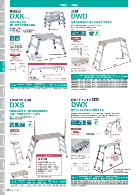 DWD-K808B▶D収納状態(DWD-K608B)折りたたみ式ですので運搬時や収納時にスペースをとりません◀W▶◀m型式天板の高さ天板寸法mm昇降面長さ520300DWD-K405B600300DWD-K606B825300DWD-K608B300825DWD-K808B※2台未満のご注文は運賃別途0.420.600.600.83設置寸法mmWD昇降面長さ813100612311369393426426467保管収納寸法mm長さ高さ185585180665150890890185奥行395430430470質量kg3.74.34.85.3価格税込価格¥24,000¥28,000¥31,000¥32,600¥26,400¥30,800¥34,100¥35,860踏ざん形状41(mm)23.2(DWD-K606B、K608B)23(DWDK405B、K808B)支柱形状44.4(DWD-K405B、K808B)45(DWD-606B、K608B)四脚アジャスト式足場台DWX脚アジャストで高さが調整できる■四脚とも支柱の長さが調節でき、フラットな足場が確保できます(最大段差約31cm)■伸縮操作レバーにダブルロック機構を採用(P.088参照)。安全性重視の設計です■DWX-W6908Cは天板が120mm広くなった幅広タイプです仕様AEJH※支柱・天板のみ認定規格Tワイドな42cm◀▶30cm▶◀約31cm◀▶最大使用質量100kg天板の高さ:0.60〜0.91mDWX-W6908C(ワイドタイプ)(段差設置状態)連結足場板DXA-STA18ADXK-39×2台+DXA-STA18A連結イメージ※詳細、その他オプションはP.084※運賃別途◀約12cmW▶▶◀DXK-39(段差設置状態)▶Dオプション(mm)48◀最大使用質量150kg天板の高さ:0.39〜0.51m支柱形状47踏ざん形状43型式天板の高さm天板寸法mmDXK-390.39〜0.51500×533設置下端寸法mm昇降面長さWD579〜606876〜950質量kg5.7価格税込価格¥100,600¥110,660手掛り棒付き足場台DXS回転収納式手掛り棒を2本標準装備で天板への昇降をサポートします■折りたたみ式で収納時も場所を取りません■軽量で持ち運びしやすい仕様AEH認定規格T最大使用質量100kg作業台/足場台足場台DWD洗車やお掃除など様々な用途で活躍する積重ねイメージ仕様認定規格■高さ、天板長さが用途に合わせて選べる全4タイプ■折りたたみ式で収納時も場所を取りませんTAJH最大使用質量100kg天板の高さ:0.42〜0.83m▶小型作業台DXKタフミニ仮設工業会認定狭い場所での作業に最適■積重ねができます■連結足場板(オプション)で連結することで、より広い作業スペースを確保できます50cm◀仕様AM認定規格U仮設工業会単品承認品※特注製作の場合、仮設認定外となりますDWX-6908C(段差設置状態)★脚の長さは伸縮レバーで、6mmピッチで調整できます(mm)▶◀◀W26.5▶▶◀約31cmD収納状態(DWX-6908C)折りたたみ式ですので運搬時や収納時にスペースをとりません支柱形状48踏ざん形状43オプション手掛り棒DXS-TE-R(右用)(1本)DXS-TE-L(左用)(1本)¥15,000(税込¥16,500)●手掛り棒高さ(mm)/608●質量(kg)/0.8※運賃別途手掛り棒収納状態収納状態※手掛り棒両側取付可能型式DXS-1010天板の高さmm1002天板寸法mm長さ昇降面1050400設置寸法mm長さ昇降面1715599質量kg10.6価格税込価格¥56,000¥61,600085型式天板の高さmDWX-6908CDWX-W6908C※2台未満のご注文は運賃別途0.60〜0.910.60〜0.91天板寸法mm長さ昇降面300825825420設置寸法mm長さDW昇降面417〜473537〜5931230〜14191230〜1419保管収納寸法mm質量kg長さ6.78907.3890奥行420540高さ180180価格税込価格¥37,600¥44,000¥41,360¥48,400TOPICSはしご脚立三脚踏台作業台・足場台トラック関連高所作業台昇降作業台足場板安全柵土木機材・荷揚げ機ブリッジ運搬機材イベント関連温室・園芸関連