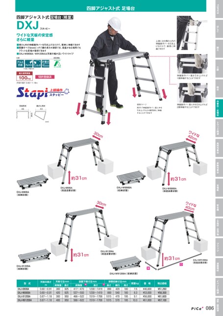 TOPICSはしご脚立三脚踏台作業台・足場台トラック関連高所作業台昇降作業台足場板安全柵土木機材・荷揚げ機ブリッジ運搬機材イベント関連温室・園芸関連上部にある横さん内の伸縮操作バーを引き上げるだけで、簡単に伸縮できます伸縮操作バー端を引き上げれば1脚伸縮することができます伸縮操作バー真ん中を引き上げれば2脚伸縮することができます▶▶使用イメージ両手で伸縮操作バー真ん中を引き上げれば4脚同時に伸縮することができます四脚アジャスト式足場台03◀mc▶▶▶(mm)支柱形状48踏ざん形状4326.5最大使用質量100kg天板の高さ:0.60〜1.18m特許登録済仕様AEJH※支柱・天板のみ認定規格T四脚アジャスト式足場台(軽量)DXJスタッピーワイドな天板の安定感さらに軽量■横さん内の伸縮操作バーを引き上げるだけで、簡単に伸縮できます■四脚すべて6mmピッチで脚の長さが調節でき、段差がある場所でもフラットな足場が確保できます■DXJ-W6908A・W91209Aは天板の幅が広いワイドタイプ◀約31cm▶DXJ-6908A(段差設置状態)DXJ-6908A(収納状態)DXJ-W6908A(収納状態)30cm▶◀◀約31cmDXJ-91209A(収納状態)▶DXJ-91209A(段差設置状態)◀WDXJ-W91209A(収納状態)型式DXJ-6908ADXJ-W6908ADXJ-91209ADXJ-W91209A天板の高さm0.60〜0.910.60〜0.910.87〜1.180.87〜1.18天板寸法mm長さ昇降面825825950950300420300400設置下端寸法mmW長さ1230〜14191230〜14191519〜17081519〜1708D保管収納寸法mm長さ89089010151015奥行420540470570高さ180180195195質量kg価格7.58.39.110.3¥46,600¥53,000¥56,000¥61,000税込価格¥51,260¥58,300¥61,600¥67,100昇降面417〜473537〜593466〜522566〜622ワイドな42cm◀▶◀約31cm▶DXJ-W6908A(段差設置状態)ワイドな40cm◀▶◀約31cm▶▶◀D▶DXJ-W91209A(段差設置状態)086