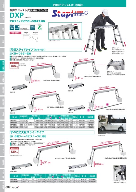 ▶▶使用イメージ両手で伸縮操作バーの真ん中を引き上げれば4脚同時に伸縮できます四脚アジャスト式足場台▶(mm)天板スライドイメージ27仕様AEH※支柱・天板のみ※DXP-S型は支柱のみ認定規格T特許登録済支柱形状49踏ざん形状43天板スライド式で広い作業床を確保四脚アジャスト式足場台(スライド)DXPスタッピー天板スライドタイプ[取手付き ]広く使って小さく収納■踏ざん内の伸縮操作バーの真ん中を引き上げれば2脚、端を引き上げれば1脚伸縮することができます■天板がスライドするので広く使ってコンパクトに収納できます■脚を開いた際に自動でロックがかかります最大使用質量100kg天板の高さ:0.55〜1.20m◀93〜150cm▶▶▶3〜1950cm▶◀DXP-S86A(段差設置状態)◀▶約41cmDXP-S120A(段差設置状態)伸縮操作バー真ん中を引き上げれば2脚、端を引き上げれば1脚伸縮できます◀▶約31cm収納状態8〜11080cm▶◀収納状態◀8〜11080cm▶◀▶約31cm天板の高さm0.55〜0.860.79〜1.200.55〜0.860.79〜1.20天板寸法mm昇降面外側280内側270長さ930〜1500930〜15001080〜18001080〜1800収納状態型式DXP-S86ADXP-S120ADXP-S86LADXP-S120LADXP-S86LA(段差設置状態)設置下端寸法mm長さ昇降面WD387〜443431〜506387〜443431〜5061372〜21311518〜23401522〜24311668〜2640収納状態保管収納寸法mm高さ長さ1045170170104512511951195170奥行390435390435質量kg価格11.412.811.913.5¥95,000¥102,000¥97,600¥104,000すのこ式天板スライドタイプ広い作業スペースにスムーズに対応■踏ざん内の伸縮操作バーの真ん中を引き上げれば2脚、端を引き上げれば1脚伸縮することができます■天板がスライドするので広く使ってコンパクトに収納できます■脚を開いた際に自動でロックがかかりますc07m3〜261▶最大使用質量120kg天板の高さ:0.60〜1.19m◀◀▶約41cmD▶DXP-S120LA(段差設置状態)使用イメージc07m3〜261▶◀W▶◀税込価格¥104,500¥112,200¥107,360¥114,400◀◀▶約31cmDXP-SX90A(段差設置状態)DXP-SX120A(段差設置状態)◀▶約34cm収納状態型式DXP-SX90ADXP-SX120A087天板の高さm0.60〜0.910.85〜1.19天板寸法mm昇降面251251長さ1626〜27001626〜2700設置下端寸法mm長さ昇降面WD401〜458447〜5091988〜32502141〜3425収納状態保管収納寸法mm高さ長さ16701501701670奥行405450質量kg価格15.416.2¥124,000¥130,000税込価格¥136,400¥143,000かがまずに立ったまま伸縮できる上部操作式TOPICSはしご脚立三脚踏台作業台・足場台トラック関連高所作業台昇降作業台足場板安全柵土木機材・荷揚げ機ブリッジ運搬機材イベント関連温室・園芸関連