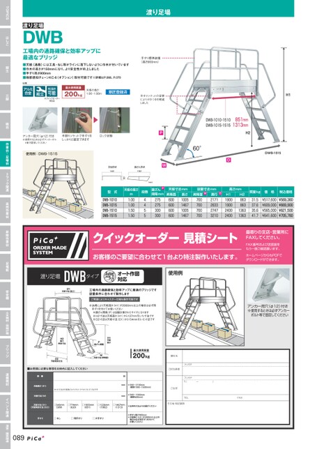 渡り足場DWB工場内の通路確保と効率アップに最適なブリッジ■天板(通路)には工具・ねじ等がラインに落下しないように巾木が付いています■巾木の高さが150mmになり、より安全性が向上しました■手すり高さ900mm■端部感知チェーンKC-6(オプション)取付可能です※詳細はP.066、P.070仕様渡り足場手すり標準装備(高さ900mm)▶AFM※クイックオーダー最大使用質量200kg対応品天板の高さ:1.00・1.50m意匠登録済手すりソケットの変更によりガタつきを軽減しました◀▶▶H1昇降面W設置寸法mm奥行2171263327473210700700700700D高さmmH11900190024002400H286386313631363質量kg価格税込価格31.537.635.641.7¥517,600¥609,000¥565,000¥641,600¥569,360¥669,900¥621,500¥705,760昇降面天板寸法mm長さ1005146710051467600600600600天板の高さm段数P踏ざん間隔mm1.001.001.501.504455275275300300(mm)30型式DWB-1010DWB-1015DWB-1510DWB-1515▶アンカー用穴(φ12)付き※使用するときは必ずアンカーボルト等で固定してください半割りソケットで手すりをしっかりと固定できますロック状態使用例:DWB‐1515支柱形状140踏ざん形状152DWB-1010・1510DWB-1015・1515851mm1313mmH260°°D◀◀▶DWB-1515P▶◀◀W▶◀クイックオーダー見積シート最寄りの支店・営業所にFAXしてください。FAX番号および送信面をもう一度ご確認願います。お客様のご要望に合わせて1台より特注製作いたします。ホームページからもPDFでダウンロードができます。アンカー用穴(φ12)付き※使用するときは必ずアンカーボルト等で固定してください貴社名フリガナご担当者様フリガナ〒(ー)ご住 所TELその他 特記事項FAX089TOPICSはしご脚立三脚踏台作業台・足場台トラック関連高所作業台昇降作業台足場板安全柵土木機材・荷揚げ機ブリッジ運搬機材イベント関連温室・園芸関連
