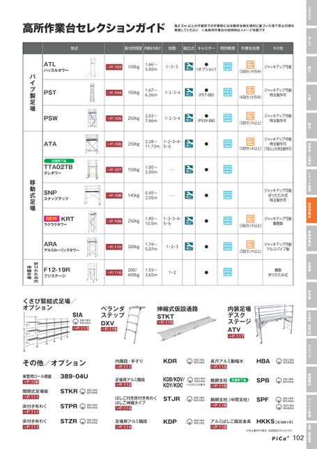 TOPICSはしご脚立三脚踏台作業台・足場台トラック関連高所作業台昇降作業台足場板安全柵土木機材・荷揚げ機ブリッジ運搬機材イベント関連温室・園芸関連高所作業台セレクションガイド高さ2m以上の作業床での作業時には労働安全衛生規則に基づいた落下防止対策を実施してください※各高所作業台の使用例はイメージ写真です型式最大使用質量作業床の高さ段数組立式キャスター特別教育作業主任者その他ATLハッスルタワー→P.103100kg1.66〜5.00m1・2・3F●(オプション)OP(3段セットのみ)ジャッキアップ可能→P.104150kg1.67〜6.26m1・2・3・4F●(PST-BB)OP(4段セットのみ)ジャッキアップ可能特注製作可→P.105250kg2.02〜7.66m1・2・3・4F●(PSW-BB)OP(3段セット以上)ジャッキアップ可能特注製作可PSTPSWATA生産終了品TTA02TBテレタワーSNPスナップアップNEWKRTラクラクタワーパイプ製足場移動式足場→P.106250kg2.28〜11.73m1・2・3・4・5・6F→P.107150kg→P.108140kg1.00〜2.00m0.45〜2.05m--FF→P.109250kg1.80〜10.0m1・2・3・4・5・6F●●●●●●OOOPジャッキアップ可能特注製作可(3段セット以上)(7段以上も特注製作可)ジャッキアップ可能折りたたみ式特注製作可OP(3段セット以上)ジャッキアップ可能鋼管製OP(3段セット以上)ジャッキアップ可能アルミパイプ製O鋼製折りたたみ式ARAアルミローリングタワー→P.110200kg1.74〜5.07m1・2・3F→P.116200/400kg1.55〜3.65m1・2F12-19Rフジステージ折りたたみ式伸縮足場くさび緊結式足場/オプションSIA仮設工業会認定合格品仮→P.113その他/オプション単管用ロール標識→P.108開閉式足場板→P.111床付き布わく→P.111床付き布わく→P.111389‐04USTKRSTPRSTZR仮設工業会認定合格品仮設工業会認定合格品仮設工業会認定合格品仮仮仮ベランダステップDXV→P.116伸縮式仮設通路STKT→P.115内装足場デスクステージATV→P.117内階段・手すり→P.111足場用アルミ階段→P.112KDR仮設工業会認定合格品仮長尺アルミ製幅木→P.115HBA仮設工業会単品承認品仮KDB/KDV/KDY/KDC仮設工業会認定合格品※KDCは対象外仮親綱支柱→P.118生産終了品SPB仮設工業会認定合格品仮はしご付き床付き布わくはしご伸縮タイプ→P.114STJR仮設工業会認定合格品仮親綱支柱(中間支柱)→P.118SPF仮設工業会認定合格品仮設工業会単品承認品仮仮足場用アルミ階段→P.114KDP仮設工業会認定合格品仮アルミはしご固定金具→P.118HKKS[エコロック]※特注製作の場合、仮設認定外となります102