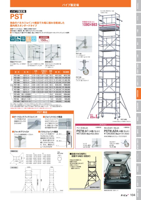 TOPICSはしご脚立三脚踏台作業台・足場台トラック関連高所作業台昇降作業台足場板安全柵土木機材・荷揚げ機ブリッジ運搬機材イベント関連温室・園芸関連パイプ製足場パイプ製足場PST独自のパネルジョイント構造で大幅に揺れを軽減した屋内用スタンダードタイプ■脚アジャスト23cm四脚とも伸縮できます■吹き抜け、階段等、狭い場所でもフレキシブルに対応■パイプ径φ42.7で握りやすく軽量。組立・解体がワンタッチで行えるオートロックフックジョイント採用仕様わく寸法(支柱中心)(㎜)1200×750作業床寸法(mm)1090×663◀▶◀▶AFMPO ※4段セットのみ 最大使用質量150kgPST-4BB※本体は5段以上の使用はできませんオプション◀▶最大23cmベースセット※運賃別途キャスターセット※運賃別途PSTW-A1(4個/セット)¥47,600(税込¥52,360)PSTW-A2A(4個/セット)¥134,000(税込¥147,400)本体の移動がよりスムーズに行えますベースアンカー用穴(φ12)付きキャスター(ストッパー付き)φ125、ウレタン製■段差がある場所に設置する場合(変型式)平地以外の場所にも設置できますあらゆる作業に合わせてお使いください※4段タイプは段差設置できません上部建わくジョイント下部建わくピン支柱・踏ざん形状42.7(mm)(mm)車載収納状態(3段セット)階段等の場所104PST-ABベース付きタイプアンカー用穴(φ12)付きPST-BBφ125キャスター(ウレタン製)付きタイプ税込価格¥612,700¥1,079,100¥1,343,760¥1,677,500¥699,600¥1,166,000¥1,430,660¥1,764,400¥264,660¥333,960¥26,400¥42,460伸縮式アウトリガーどんな場所でもしっかり固定できます壁当て壁に当てて使用すると作業台の安定性がアップします開閉式建わく左右どちらからでも足場の通り抜けが可能です(1〜4段セット)価格名称型式全高m作業床の高さm1段セット2段セット3段セット4段セット1段セット2段セット3段セット4段セット1.67〜1.903.07〜3.304.47〜4.705.87〜6.101.83〜2.063.23〜3.464.63〜4.866.03〜6.262.70〜2.934.10〜4.335.50〜5.736.90〜7.132.86〜3.094.26〜4.495.66〜5.897.06〜7.29PST-1ABPST-2ABPST-3ABPST-4ABPST-1BBPST-2BBPST-3BBPST-4BBPST-A2BPST-A4BPST-KAPST-AUS質量kg55.0 97.0 122.6155.2 60.5102.5128.1160.725.6 32.6 1.8 3.4※2〜4段セットには壁当て・アウトリガーが含まれています(1段セットには含まれません)※PST1段に中階を組み合わせて2段以上にする際は併わせてアウトリガーPST-AUSを4本ご使用ください※PST-4BBを移動する際は、2段以下まで解体して長手方向に移動してください※この製品は屋内用です※製品の長さや地域により、お届けが困難な場合があります。都度お問い合わせください¥557,000¥981,000¥1,221,600¥1,525,000¥636,000¥1,060,000¥1,300,600¥1,604,000¥240,600¥303,600¥24,000¥38,600中階(2〜3段目増設時)中階(4段目増設時)壁当て(1本)伸縮式アウトリガー(1本)————————キャスター25φ1付きベース付きPST構造■オートロックフックジョイントフックを掛ければ自動的にロックがかかります■ジャッキアジャストアジャスト調節範囲0〜23cm■ジョイントカシメ構造ジョイントとパイプは全てこのカシメによって接合されており、溶接と比べて数倍の強度があります■パネルジョイント構造ジョイント先端がクサビ形になっており、連結部のすきまがなく、本体の揺れが大幅に少なくなりました。また、連結もスムーズに行えますABPST-2AB PST-3ABPST-4AB PST-2BBPST-3BB PST-4BB :::::: 1594~29781144~2528 1919~29781469~2528 2287~29781837~2528 1594~29781144~2528 1919~29781469~2528 2287~29781837~2528B66345゜45゜1090A作業床寸法230全高作業床の高さわく寸法1200750