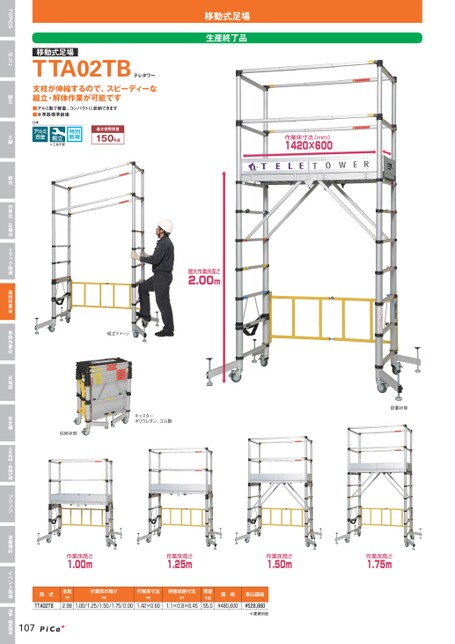 移動式足場TTA02TBテレタワー支柱が伸縮するので、スピーディーな組立・解体作業が可能です■アルミ製で軽量。コンパクトに収納できます■水準器標準装備仕様AFO ※工具不要 最大使用質量150kg組立イメージ移動式足場生産終了品作業床寸法(mm)1420×600▶◀▶◀◀最大作業床高さ2.00m▶キャスターポリウレタン、ゴム製収納状態設置状態作業床高さ1.00m作業床高さ1.25m作業床高さ1.50m作業床高さ1.75m型式TTA02TB全高m2.98作業床の高さm作業床寸法m保管収納寸法m1.00/1.25/1.50/1.75/2.001.42×0.601.1×0.8×0.45質量kg55.0価格税込価格¥480,600¥528,660※運賃別途107TOPICSはしご脚立三脚踏台作業台・足場台トラック関連高所作業台昇降作業台足場板安全柵土木機材・荷揚げ機ブリッジ運搬機材イベント関連温室・園芸関連