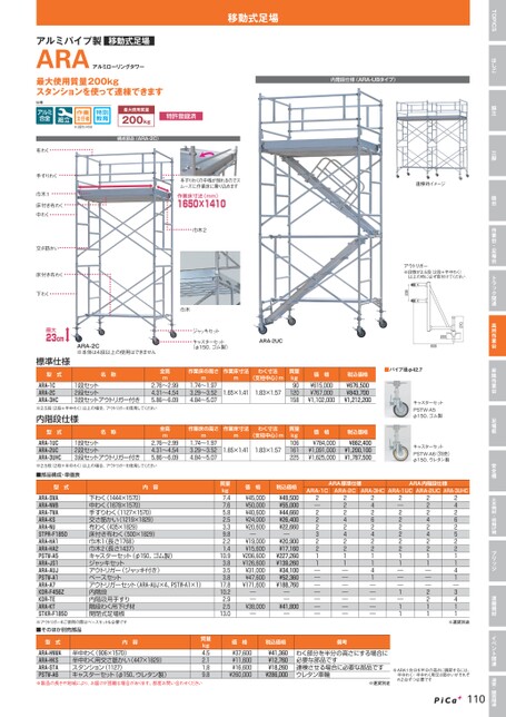 TOPICSはしご脚立三脚踏台作業台・足場台トラック関連高所作業台昇降作業台足場板安全柵土木機材・荷揚げ機ブリッジ運搬機材イベント関連温室・園芸関連連棟時イメージ370200609アウトリガー※段数が2.5段(2段+半中わく)以上の時に必ず取付けてください238■パイプ径φ42.7キャスターセットPSTW-A5φ150、ゴム製キャスターセットPSTW-A6(別売)φ150、ウレタン製質量kg 90120158質量kg106161225価格¥615,000¥767,000¥1,102,000税込価格¥676,500¥843,700¥1,212,200価格¥784,000¥1,091,000¥1,625,000税込価格¥862,400¥1,200,100¥1,787,500ARA標準仕様ARA内階段仕様ARA-2CARA-3HCARA-1UCARA-2UCARA-3UHC価格¥45,000¥50,000¥40,600¥24,000¥20,600―¥19,000¥15,600¥206,600¥126,600¥31,000¥47,600¥171,600―――税込価格¥49,500¥55,000¥44,660¥26,400¥22,660―¥20,900¥17,160¥227,260¥139,260¥34,100¥52,360¥188,760―――ARA-1C2―22232211―――――――¥38,000¥41,8002224242211―――――――242624221141―――――2―22222211―――1―112224242211―――2211242625221141―3411アルミパイプ製移動式足場ARAアルミローリングタワー最大使用質量200kgスタンションを使って連棟できます仕様移動式足場内階段仕様(ARA-UBタイプ)AFPO※3段セットのみ 最大使用質量200kg構成部品(ARA-2C)特許登録済◀▶◀▶手すりわくの中桟が倒れるのでスムーズに作業床に乗り込めます作業床寸法(mm)1650×1410巾木2巾木ジャッキセットキャスターセット(φ150、ゴム製)ARA-2UCARA-2C※本体は4段以上の使用はできません名称1段セット2段セット3段セットアウトリガー付き全高m2.76〜2.994.31〜4.545.86〜6.09m1.74〜1.973.29〜3.524.84〜5.07作業床の高さ作業床寸法わく寸法(支柱中心)mm1.65×1.411.83×1.57布わく手すりわく巾木1床付き布わく中わく交さ筋かい床付き布わく下わく◀▶最大23cm標準仕様型式ARA-1CARA-2CARA-3HC作業床の高さ作業床寸法わく寸法(支柱中心)mm1.65×1.411.83×1.57※2.5段(2段+半中わく)以上の場合、アウトリガーを使用してください内階段仕様型式ARA-1UCARA-2UCARA-3UHC名称1段セット2段セット3段セットアウトリガー付き全高m2.76〜2.994.31〜4.545.86〜6.09m1.74〜1.973.29〜3.524.84〜5.07※2.5段(2段+半中わく)以上の場合、アウトリガーを使用してください■部品構成・単価表型式ARA-SWAARA-NWBARA-TWAARA-KSARA-NUSTPR-F1850ARA-HA1ARA-HA2PSTW-A5ARA-JS1ARA-AUJPSTW-A1ARA-A7KDR-F456ZKDR-TEARA-KTSTKR-F1850内容下わく(1444×1570)中わく(1678×1570)手すりわく(1127×1570)交さ筋かい(1219×1829)布わく(435×1829)床付き布わく(500×1829)巾木1(長さ1768)巾木2(長さ1437)キャスターセット(φ150、ゴム製)ジャッキセットアウトリガー(ジャッキ付き)ベースセットアウトリガーセット(ARA-AUJ×4、PSTW-A1×1)内階段内階段用手すり階段わく吊下げ材開閉式足場板質量kg7.4 7.6 5.8 2.5 3.3 9.8 2.2 1.410.93.8 3.5 3.817.810.22.9 2.513.0※アウトリガーをご使用の際はベースセットも必要です■そのほか別売部品内容質量型式kg4.5ARA-HNWA2.1 ARA-HKS1.8 ARA-STA9.8PSTW-A6※製品の長さや地域により、お届けが困難な場合があります。都度お問い合わせください※半中わく(906×1570)半中わく用交さ筋かい(447×1829)スタンション(1127)キャスターセット(φ150、ウレタン製)価格¥37,600¥11,600¥16,600¥260,000税込価格¥41,360¥12,760¥18,260¥286,000備考わく部分を半分の高さにする場合に必要な部品です連棟させる場合に必要な部品ですウレタン車輪運賃別途※運賃別途※ARA1台分を半分の高さに調節するには、半中わく・半中わく用交さ筋かいがそれぞれ2台ずつ必要です110