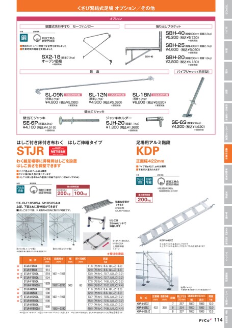 TOPICSはしご脚立三脚踏台作業台・足場台トラック関連高所作業台昇降作業台足場板安全柵土木機材・荷揚げ機ブリッジ運搬機材イベント関連温室・園芸関連くさび緊結式足場オプション/その他オプション据置式先行手すりセーフハンガー張り出しブラケット仕様C 認定規格U仮設工業会認定合格品■独自のストッパー機能で安全性を確保しました■作業時間の短縮を実現しましたSX2-18(質量7.3kg)オープン価格※運賃別途SBH-40※運賃別途SBH-40(規格600mm質量3.3kg)¥5,200(税込¥5,720)SBH-25(規格400mm質量2.7kg)¥4,600(税込¥5,060)SBH-20(規格200mm質量1.8kg)¥3,800(税込¥4,180)※運賃別途※運賃別途筋違パイプジャッキ(自在型)SL-12N1200mm用¥4,900(税込¥5,390)(質量2.7kg)※運賃別途SL-18N1800mm用¥6,200(税込¥6,820)(質量4.0kg)※運賃別途壁当てジャッキSL-09N¥4,600(税込¥5,060)900mm用(質量2.4kg)※運賃別途壁当てジャッキSE-6P(質量2.2kg)¥4,100(税込¥4,510)※運賃別途ジャッキホルダーSJH-20(質量1.1kg)¥1,800(税込¥1,980)※運賃別途SE-6S(質量2.8kg)¥4,200(税込¥4,620)※運賃別途STJR登録番号:KK-180006はしご付き床付き布わくはしご伸縮タイプわく組足場等に昇降用はしごを設置はしご長さを調整できます■パイプ径φ42.7、φ48.6兼用■サビに強く耐久性に優れています■はしごは床付き布わくの裏面に収納できます(1850サイズのみ)仕様A 認定規格U仮設工業会認定合格品最大使用質量床付き布わく200kgはしご100kgSTJR-F1850SA、M1850SAは上部、下部ともに脚伸縮ができます■はしごはツマ側、ケタ側の4方向に取付け可能です。取付け例-1(ツマ側)※掲載写真は撮影のための簡易設営です取付け例-2(ケタ側)足場用アルミ階段KDP正面幅422mm■パイプ径φ42.7、φ48.6兼用■すきまなく重ねられます仕様認定規格AM 最大使用質量200kg積重ね保管ができます収納状態STJR-F1850Aはしごは25mmピッチで伸縮します◀STJR-F1850SA、M1850SA上部脚伸縮イメージ★受注生産品U仮設工業会認定合格品※ 注製作の場合、 仮設認定外となりますKDP-M427Z※上部のつかみ金具はロック付です※上下のつかみ金具ロック付きタイプも特注製作承ります使用イメージ※掲載写真は撮影のための簡易設営です型式KDP-M427ZKDP-M428ZKDP-M428JZ正面幅mm踏板の幅mm段数蹴上げ寸法(h)mm422368788257224237適用足場寸法mm幅180018001800高さ180018001900質量kg12.013.013.51141601〜19551582〜2280500801601〜19551582〜228011.6(布わく:8.4、はしご:3.2)12.0(布わく:8.8、はしご:3.2)13.9(布わく:10.7、はしご:3.2)15.9(布わく:12.7、はしご:3.2)17.8(布わく:14.6、はしご:3.2)19.6(布わく:15.2、はしご:4.4)11.6(布わく:8.4、はしご:3.2)12.0(布わく:8.8、はしご:3.2)13.7(布わく:10.5、はしご:3.2)15.8(布わく:12.6、はしご:3.2)17.7(布わく:14.5、はしご:3.2)19.0(布わく:14.6、はしご:4.4)質量kg厚み(収納時)mmm幅m設置高さmm芯寸法mm 610 914121915241829600 900120015001800型式STJR-F650ASTJR-F950ASTJR-F1250ASTJR-F1550ASTJR-F1850ASTJR-F1850SASTJR-M650ASTJR-M950ASTJR-M1250ASTJR-M1550ASTJR-M1850ASTJR-M1850SAインチ★★★★メートル★★★★※F型はインチサイズ、M型はメートルサイズのわくに対応します※STJR-F1850SA、STJR-M1850SAはくさび緊結足場用です