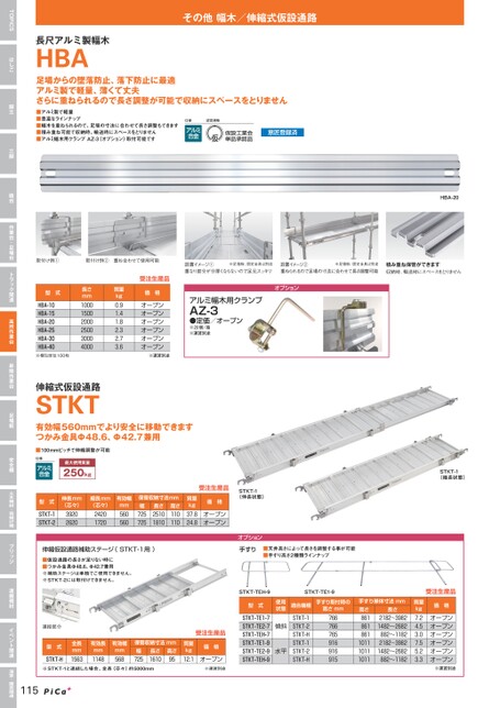 その他幅木/伸縮式仮設通路長尺アルミ製幅木HBA足場からの墜落防止、落下防止に最適アルミ製で軽量、薄くて丈夫さらに重ねられるので長さ調整が可能で収納にスペースをとりません■アルミ製で軽量■豊富なラインナップ■幅木を重ねられるので、足場の寸法に合わせて長さ調整もできます■積み重ね可能で収納時、輸送時にスペースをとりません■アルミ幅木用クランプAZ-3(オプション)取付可能です仕様認定規格AU仮設工業会単品承認品意匠登録済HBA-20設置イメージ①※足場板、固定金具は別途重なり部分が分厚くならないので足元スッキリ設置イメージ②※足場板、固定金具は別途重ねられるので足場の寸法に合わせて長さ調整可能積み重ね保管ができます収納時、輸送時にスペースをとりませんオプションアルミ幅木用クランプAZ-3※20個/箱※運賃別途●定価/オープン取付け例①取付け例②重ね合わせて使用可能型式HBA-10HBA-15HBA-20HBA-25HBA-30HBA-40※梱包単位100枚長さmm100015002000250030004000質量kg0.91.41.82.32.73.6受注生産品価格オープンオープンオープンオープンオープンオープン※運賃別途伸縮式仮設通路STKT有効幅560mmでより安全に移動できますつかみ金具Φ48.6、Φ42.7兼用■100mmピッチで伸縮調整が可能仕様A 型式STKT-1STKT-2最大使用質量250kg伸長mm(芯々)縮長mm(芯々)3920262024201720有効幅mm560560保管収納寸法mm高さ幅110725725110長さ25101810質量kg37.824.8価格オープンオープン受注生産品STKT-1(伸長状態)伸縮仮設通路補助ステージ(STKT-1用)■仮設通路の長さが足りない時に■つかみ金具Φ48.6、Φ42.7兼用※補助ステージは単独でご使用できません。※STKT-2には取付けできません。連結部分有効幅型式全長mm1563有効長mm1148長さ1610※STKT-1と連結した場合、全長(芯々)約5000mm※STKT-Hmm568保管収納寸法mm高さ幅72595オプション手すり■天井高さによって長さを調整する事が可能■手すり高さ2種類ラインナップSTKT-TEH-9型式STKT-TE1-7STKT-TE2-7STKT-TEH-7STKT-TE1-9STKT-TE2-9STKT-TEH-9使用状態傾斜水平STKT-TE1-9適合機種手すり取付時の高さmmSTKT-1STKT-2STKT-HSTKT-1STKT-2STKT-H766766765916916915受注生産品質量kg12.1価格オープン運賃別途※長さ手すり単体寸法mm高さ8618618611011101110112182~39821482〜2682882〜11822182~39821482〜2682882〜1182115STKT-1(縮長状態)質量kg7.24.53.07.55.23.3受注生産品価格オープンオープンオープンオープンオープンオープン運賃別途TOPICSはしご脚立三脚踏台作業台・足場台トラック関連高所作業台昇降作業台足場板安全柵土木機材・荷揚げ機ブリッジ運搬機材イベント関連温室・園芸関連
