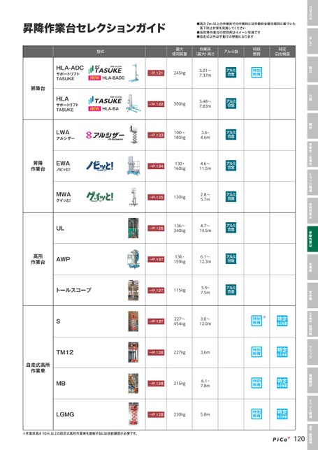 TOPICSはしご脚立三脚踏台作業台・足場台トラック関連高所作業台昇降作業台足場板安全柵土木機材・荷揚げ機ブリッジ運搬機材イベント関連温室・園芸関連昇降作業台セレクションガイド■高さ2m以上の作業床での作業時には労働安全衛生規則に基づいた落下防止対策を実施してください■各昇降作業台の使用例はイメージ写真です■自走式以外は手動での移動になります型式最大使用質量作業床(最大)高さアルミ製HLA-ADCサポートリフトTASUKENEWHLA-BADC→P.121245kg特定自主検査特別教育O昇降台HLAサポートリフトTASUKELWAアルシザーNEWHLA-BA→P.122300kg→P.123100〜180kg3.6・4.6m3.01〜7.37m3.48〜7.83mAAAAAAAA昇降作業台EWAノビッと!伸びる電動リフト!→P.124130・160kg4.6〜11.5mMWAグイッと!UL→P.125130kg2.8〜5.7m→P.126136〜340kg4.7〜14.5m高所作業台AWP→P.127136・159kg6.1〜12.3mトールスコープ→P.127115kg5.9・7.5m自走式高所作業車STM12MBLGMG→P.127227〜454kg3.0〜12.0m→P.128227kg3.6m→P.128215kg6.1・7.8m→P.128230kg5.8m※OQOQOQOQ※作業床高さ10m以上の自走式高所作業車を運転するには技能講習が必要です。120