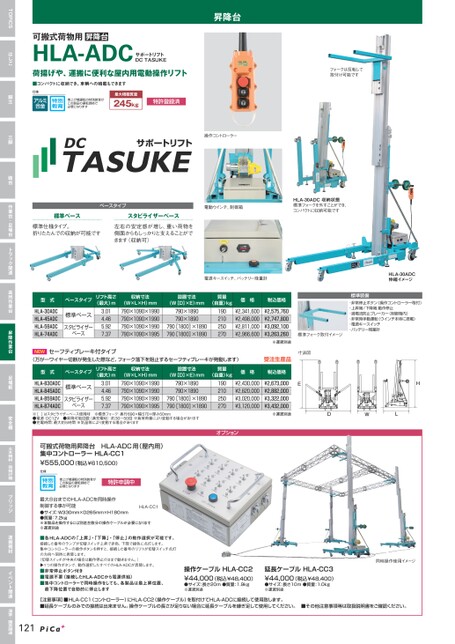 可搬式荷物用 昇降台HLA-ADCサポートリフトDC TASUKE荷揚げや、運搬に便利な屋内用電動操作リフト■コンパクトに収納でき、車輌への積載もできます仕様AO巻上げ機運転の特別教育がこの製品の運転資格で必要となります最大積載質量245kg特許登録済昇降台操作コントローラーフォークは反転して取付け可能ですベースタイプ電動ウインチ、制御箱標準ベース標準仕様タイプ。折りたたんでの収納が可能ですスタビライザーベース左右の安定感が増し、重い荷物を側面からもしっかりと支えることができます(収納可)HLA-30ADC収納状態標準フォークを外すことができ、コンパクトに収納可能です型式ベースタイプリフト高さ(最大)mHLA-30ADCHLA-45ADCHLA-59ADCHLA-74ADC※標準ベーススタビライザーベース3.014.465.927.37電源キースイッチ、バッテリー残量計収納寸法(W×L×H)mm790×1090×1990790×1090×1990790×1090×1990790×1090×1995設置寸法(W[D]×E)mm質量(自重)kg790×1890790×1890790[1800]×1890790[1800]×1890190210250270価格税込価格¥2,341,600¥2,498,000¥2,811,000¥2,966,600¥2,575,760¥2,747,800¥3,092,100¥3,263,260標準フォーク取付イメージHLA-30ADC伸縮イメージ標準装備・非常停止ボタン(操作コントローラー取付)・上昇端/下降端動作停止・過電流防止ブレーカー(制御箱内)・非常時手動運転(ウインチ本体に搭載)・電源キースイッチ・バッテリー残量計NEWセーフティブレーキ付タイプ(万が一ワイヤー切断が発生した際など、フォーク落下を阻止するセーフティブレーキが発動します)運賃別途受注生産品寸法図型式ベースタイプHLA-B30ADCHLA-B45ADCHLA-B59ADCHLA-B74ADC標準ベーススタビライザーベースリフト高さ(最大)m3.014.465.927.37収納寸法(W×L×H)mm790×1090×1990790×1090×1990790×1090×1990790×1090×1995設置寸法(W[D]×E)mm質量(自重)kg価格税込価格790×1890790×1890790[1800]×1890790[1800]×1890190210250270¥2,430,000¥2,620,000¥3,020,000¥3,120,000EE¥2,673,000¥2,882,000¥3,322,000¥3,432,000※運賃別途HHDDWWLL※[]はスタビライザーベース使用時※標準フォーク:奥行690×幅570×厚み50mm●電源:DC12V●昇降可能回数(満充電時):約30〜50回※負荷荷重により変動する場合があります●充電時間:最大約5時間※気温等により変動する場合がありますオプション可搬式荷物用昇降台HLA-ADC用(屋内用)集中コントローラーHLA-CC1¥555,000(税込¥610,500)仕様O巻上げ機運転の特別教育がこの製品の運転資格で必要となります特許申請中最大8台までのHLA-ADCを同時操作制御する事が可能●サイズ:W330mm×D265mm×H180mm●質量:7.2kg※本製品を操作するには別途台数分の操作ケーブルが必要になります※運賃別途HLA-CC1■各HLA-ADCの「上昇」・「下降」・「停止」の動作選択が可能です。接続した番号のランプが切替スイッチ上昇で赤色、下降で緑色に点灯します。集中コントローラーの操作ボタンを押すと、接続した番号のリフトが切替スイッチ点灯の方向へ同時に昇降します。(切替スイッチが中央の場合は動作停止のままで動きません。)▶1つの操作ボタンで、動作選択したすべてのHLA-ADCが昇降します。■非常停止ボタン付き■電源不要(接続したHLA-ADCから電源供給)■集中コントローラーで同時操作をしても、各製品は最上昇位置、最下降位置で自動的に停止します操作ケーブルHLA-CC2¥44,000(税込¥48,400)●サイズ:長さ20m●質量:1.9kg※運賃別途延長ケーブルHLA-CC3¥44,000(税込¥48,400)●サイズ:長さ10m●質量:1.0kg※運賃別途同時操作使用イメージ【注意事項】■HLA-CC1(コントローラー)にHLA-CC2(操作ケーブル)を取付けてHLA-ADCに接続して使用致します。■延長ケーブルのみでの接続は出来ません。操作ケーブルの長さが足りない場合に延長ケーブルを継ぎ足して使用してください。■その他注意事項等は取扱説明書をご確認ください。121TOPICSはしご脚立三脚踏台作業台・足場台トラック関連高所作業台昇降作業台足場板安全柵土木機材・荷揚げ機ブリッジ運搬機材イベント関連温室・園芸関連