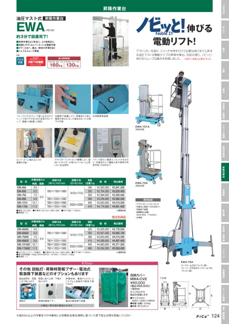 TOPICSはしご脚立三脚踏台作業台・足場台トラック関連高所作業台昇降作業台足場板安全柵土木機材・荷揚げ機ブリッジ運搬機材イベント関連温室・園芸関連油圧マスト式 昇降作業台EWAノビッと!約3分で設置完了!■高所作業をより安全に、より効率的に■収納しやすくエレベーターにも積載可能■タワーと比べ、組立・解体の手間を省く■1人でもスムーズ移動仕様A登録番号:KK-180035最大使用質量EWA-46A、60A、75A160kgEWA-89A、101A、115A130kg昇降作業台伸びる電動リフト!アウトリガーを張り、スイッチを押すだけで必要な高さまで上昇する油圧マスト式電動タイプの昇降作業台。名前の通り、ノビッと!伸びるスムーズな動きを実現しました。※操作に資格は必要ありませんフォークリフトのフォーク差し込み口やクレーンで吊り下げるための金具が付いていて、運搬にも配慮した設計手動降下装置により、停電時など急に電源が使えなくなった場合もゆっくりと降下が可能水準器標準装備EWA-101A収納状態エレベーターに積み込んでの運搬も可能!アウトリガーインターロック機構により、適切にアウトリガーが張られていないと上昇しない安全設計バケット部分に電源コンセントがあるので、作業床の上で電動工具や照明が利用可能(700Wまで)型式EWA-46AEWA-60AEWA-75AEWA-89AEWA-101AEWA-115A作業床高さm伸長縮長4.66.07.58.910.111.50.4収納寸法(W×L×H)mm設置寸法(D×E)mm質量(自重)kg価格税込価格780×1190×1980780×1230×1980780×1320×1980780×1350×19801410×17102020×2350290320350380445475¥2,583,000¥2,754,000¥2,994,000¥3,236,600¥3,833,000¥4,174,000●電源:AC100V●作業床寸法(mm):660×680●手すり高さ:1100mm●乗員数:1人¥2,841,300¥3,029,400¥3,293,400¥3,560,260¥4,216,300¥4,591,400※運賃別途受注生産品EWA-75A収納状態標準装備・アウトリガーインターロック・作業床上電源(700Wまで)・手動降下装置・過積載防止装置(EWA-89A、115Aのみ)・水準器収納寸法(W×L×H)mm設置寸法(D×E)mm質量(自重)kg価格税込価格型式作業床高さm伸長縮長4.66.07.58.910.111.50.4780×1190×1980EWA-46ADCEWA-60ADCEWA-75ADCEWA-89ADCEWA-101ADCEWA-115ADC325355385415455485●DC12Vバッテリ―(充電式)●作業床寸法(mm):660×680●手すり高さ:1100mm●最大使用質量:160㎏(EWA-89ADC、101ADC、115ADC:130㎏)●乗員数:1人780×1230×1980780×1320×1980780×1350×19801410×17102020×2350¥3,435,000¥3,591,000¥3,833,000¥4,088,600¥4,883,000¥5,054,000¥3,778,500¥3,950,100¥4,216,300¥4,497,460¥5,371,300¥5,559,400※運賃別途オプションその他 回転灯・昇降時警報ブザー・電池式緊急降下装置などのオプションもあります製品使用中、周囲に光で知らせます周囲に音で上昇・下降を知らせます停電時等、電源がとれないところでも上部操作で緊急下降できます回転灯昇降時警報ブザー電池式緊急降下装置※製品へ取付後の納品となります収納カバーMWA-CV2¥60,000(税込¥66,000)※運賃別途ホコリなどから製品を保護します●サイズ(mm):800×1300×1850H●質量(自重):3.0kg●材質:ポリエチレン※高さ2m以上の作業床での作業時には労働安全衛生規則に基づいた落下防止対策を実施してくださいEWA-75Aキャスターφ200(ウレタン製)、ストッパー付き自在キャスターφ150(ウレタン製)寸法図HEWLD124