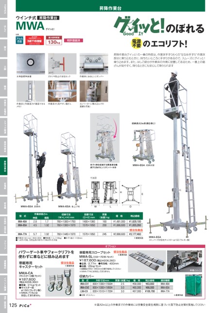 昇降作業台ウインチ式 昇降作業台MWAグイッと!仕様A最大使用質量130kg特許登録済登録番号:KK-180035昇降作業台グイッと!の一番の特長は、作業床手すりわくの“ななめ手すり”作業床部分に乗り込むときに、持ちたいところに手すりがあるので、スムーズにグイッと!乗り込めます。また、はしご部分が作業床の外側に設置してあるため、一番上の踏ざんが見やすく、降りるときにも安心して降りられます水準器標準装備ガタツキ防止の支柱ロック作業床にあるヒンジダンパー作業床と作業高さが確認できるメモリ作業床から見やすい踏ざんエレベーターに積み込んでの運搬も可能!収納高さ2m未満仕様に!手すり枠を収納する際負荷を軽減する為のヒンジダンパー付きMWA-65A収納状態寸法図HEMWA-65A昇降時MWA-65A巻上げ時WLD型式MWA-48AMWA-65A伸長2.84.5MWA-77A5.7作業床高さm縮長1.71.921.92収納寸法(W×L×H)mm760×1300×1750760×1300×1970設置寸法(D×E)mm1400×13601570×1650760×1445×19701570×1850●作業床寸法(mm):600×600●乗員数:1人(130kg)●手すり高さ:1100mm●一点吊り可能、別売金具の取付けで四点吊りも可能質量(自重)kg価格税込価格160200245¥1,481,000¥1,666,600¥2,888,600¥1,629,100¥1,833,260受注生産品¥3,177,460※運賃別途オプションMWA-65Aストッパー付き自在キャスターφ150(ウレタン製)パワーゲート車やフォークリフトを使わずに車などに積み込めます車載専用キャスターセット受注生産品※運賃別途MWA-CA(キャスター3個/セット)¥187,600(税込¥206,360)●質量/21kg/セット●キャスター径/φ150(ウレタン製)※MWA-77Aには対応しておりません125受注生産品※運賃別途車載専用スロープセットMWA-SL(スロープ2本/セット)¥187,600(税込¥206,360)●全長/2.77m●有効幅/400mm●自重/25kg/セット※設置高さ650~850mmの間で使用してください※MWA-77Aには対応しておりません車載イメージ収納カバー型式MWA-CV1MWA-CV2LWA-CV外形寸法mm800×1300×1550H800×1300×1850H830×1510×1720H●材質:ポリエチレン質量(自重)kg2.53.03.0価格¥58,000¥60,000¥97,000税込価格¥63,800¥66,000¥106,700適合機種MWA-48AMWA-65AMWA-77A※運賃別途※高さ2m以上の作業床での作業時には労働安全衛生規則に基づいた落下防止対策を実施してくださいTOPICSはしご脚立三脚踏台作業台・足場台トラック関連高所作業台昇降作業台足場板安全柵土木機材・荷揚げ機ブリッジ運搬機材イベント関連温室・園芸関連