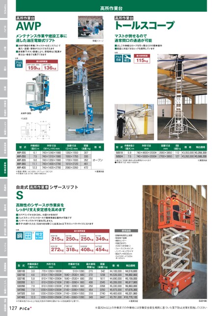 ■はしごの伸縮はロープを引っ張るだけの簡単操作■段差に対応できるレッグを採用しています仕様AF最大使用質量115kg質量(自重)kg価格307330352461472オープン※運賃別途型式5051850524作業床高さ(最大)m外形寸法mm設置寸法mm質量(自重)kg5.97.5740×4600×2030H740×5300×2030H2060×38502700×3850112127※組立をご希望の場合は別途費用がかかります●作業床寸法:465×450mm価格税込価格¥3,053,000¥3,358,300¥3,262,000¥3,588,200※運賃別途■AWP独自の車輪(キャスター6点システム)で搬入・設置・移動がひとりでも行えます■非常降下ボタン装備により、停電時など電源が使えない場合でも降下できます仕様A最大使用質量AWP-20S〜36S159kgAWP-40S136kg作業床高さ(最大)m6.17.59.011.112.3外形寸法(W×L×H)mm740×1240×1980740×1310×1980740×1350×1980740×1400×2780740×1420×2780設置寸法(D×E)mm1350×15501550×17501730×19301910×21202060×2260※電源(標準):AC100V、(オプション)DC12V※作業床寸法(A×B):690×660mmBAWDAWP-30S寸法図HEL型式AWP-20SAWP-25SAWP-30SAWP-36SAWP-40SS自走式 高所作業車 シザースリフト高剛性のシザースが作業床をしっかり支え安定感を高めます■ステアリングが大きくきれ、小回りがききます■ジョイスティックコントロールで簡単快適な操作が可能です■ノンマーキングタイヤで床を汚しません■手すりを折りたたむ(S3010Eを除く)と全高2m以下のコンパクトサイズになります仕様※COQ最大使用質量S3010E215kgS3219E250kgS3226E250kgS4740E349kgS3215E272kgS4732E318kgS3220E408kgS4726E454kg標準装備・脱輪時転倒防止装置・緊急降下装置・傾斜センサー・可倒式手すり(S3010Eを除く)・フォークリフトポイント・ノンマーキングタイヤ・張出デッキ約90cm(S4726E・4732Eは約120cm)型式S3010ES3215ES3219ES3220ES3226ES4726ES4732ES4740E作業床高さ(最大)m外形寸法mm3.04.65.86.17.97.99.812.0770×1260×1800H810×1780×2000H810×1780×2090H810×2300×2160H810×2300×2300H1200×2300×2300H1200×2300×2390H1200×2300×2560H作業床寸法mm510×10906801640~2530×6801640~2530×6602180~3090×2180~3090×6602140~3390×10502140~3390×10502140~3360×1090※作業床高さ10m以上の自走式高所作業車を運転するには技能講習が必要です。最大使用質量kg質量(自重)kg2152722504082504543183495421238161120452268225027403447価格税込価格¥4,106,000¥4,539,000¥4,690,000¥6,289,000¥6,330,000¥6,973,000¥8,483,600¥9,791,000¥4,516,600¥4,992,900¥5,159,000¥6,917,900¥6,963,000¥7,670,300¥9,331,960¥10,770,100※運賃別途S3219E127※高さ2m以上の作業床での作業時には労働安全衛生規則に基づいた落下防止対策を実施してください高所作業台高所作業台AWPメンテナンス作業や建設工事に適した油圧電動式リフト積載イメージ高所作業台トールスコープマストが倒せるので通常間口の通過が可能TOPICSはしご脚立三脚踏台作業台・足場台トラック関連高所作業台昇降作業台足場板安全柵土木機材・荷揚げ機ブリッジ運搬機材イベント関連温室・園芸関連