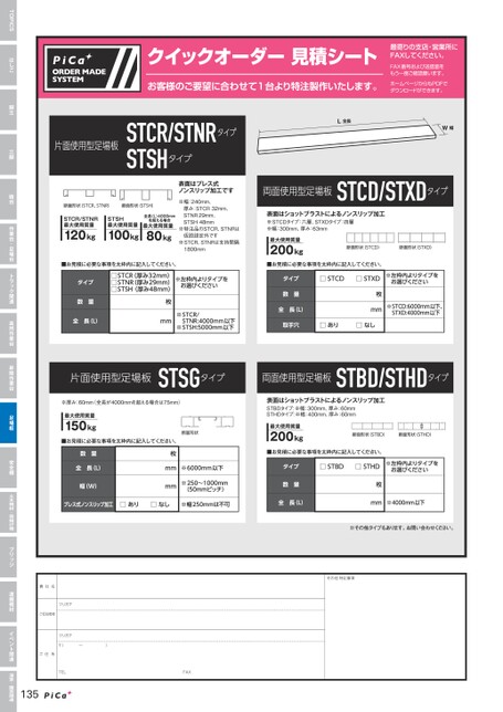 クイックオーダー見積シート最寄りの支店・営業所にFAXしてください。FAX番号および送信面をもう一度ご確認願います。お客様のご要望に合わせて1台より特注製作いたします。ホームページからもPDFでダウンロードができます。その他特記事項貴社名フリガナご担当者様フリガナ〒(ー)ご住所TEL135FAXTOPICSはしご脚立三脚踏台作業台・足場台トラック関連高所作業台昇降作業台足場板安全柵土木機材・荷揚げ機ブリッジ運搬機材イベント関連温室・園芸関連