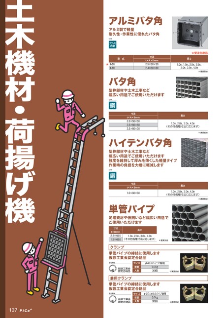 アルミバタ角アルミ製で軽量耐久性・作業性に優れたバタ角◀A◀▶t▶▶B◀仕様A型式★M-50M-60寸法t×A×Bmm2.5×50×502.4×60×60★受注生産品長さ1.0m、1.5m、2.0m、2.5m、3.0m、3.5m、4.0m※運賃別途バタ角型枠部材や土木工事など幅広い用途でご使用いただけます仕様C寸法t×A×Bmm2.3×50×502.3×60×602.3×60×30長さ1.0m、2.0m、3.0m、4.0m(その他各種寸法に応じます)※運賃別途ハイテンバタ角型枠部材や土木工事など幅広い用途でご使用いただけます強度を維持して厚みを薄くした軽量タイプ作業時の負担を大幅に軽減します仕様C寸法t×A×Bmm1.6×60×60長さ1.0m、2.0m、3.0m、4.0m(その他各種寸法に応じます)※運賃別途単管パイプ足場資材や仮囲いなど幅広い用途でご使用いただけます寸法t×Dmm2.4×48.61.8×48.6長さ1.0m、2.0m、3.0m、4.0m(その他各種寸法に応じます)※運賃別途クランプ単管パイプの締結に使用します仮設工業会認定合格品認定規格U仮設工業会認定合格品サイズ単重入数φ48.6パイプ専用0.7kg30個兼用クランプ単管パイプの締結に使用します仮設工業会認定合格品認定規格U仮設工業会認定合格品サイズ単重入数φ42.7/φ48.6パイプ兼用0.7kg30個※運賃別途※運賃別途土木機材・荷揚げ機137