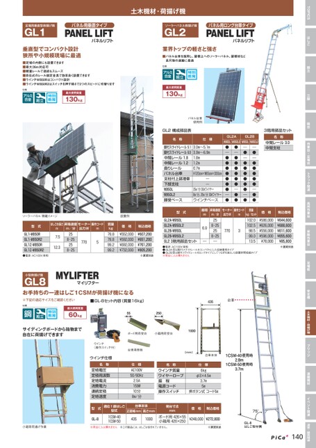 TOPICSはしご脚立三脚踏台作業台・足場台トラック関連高所作業台昇降作業台足場板安全柵土木機材・荷揚げ機ブリッジ運搬機材イベント関連温室・園芸関連土木機材・荷揚げ機ソーラーパネル荷揚げ機GL2パネル用ロング台車タイプPANELLIFTパネルリフト業界トップの軽さと強さ■パネル台車を採用し、屋根上へのソーラーパネル、屋根材など長尺物の運搬に最適足場用垂直型荷揚げ機GL1パネル用垂直タイプPANELLIFTパネルリフト垂直型でコンパクト設計狭所や小規模現場に最適■足場の内側にも設置できます■最大26m対応可■軽量レールで連結もスムーズ■自在式のレール固定金具で効率良く設置できます■ウインチW850Rはコンパクト設計■ウインチW850R2はスイッチを押す強さで2つのスピードに切替ります仕様AFO最大使用質量130kgソーラーパネル積載イメージ設置例型式GL1-W850RGL1-W850R2GL1Z-W850RGL1Z-W850R2●電源:AC100V単相はしごの長さm昇降速度m/分モーター出力W操作コードm7.512.38・2525258・257705質量kg78.878.899.299.2価格税込価格¥552,000¥592,000¥692,000¥732,000¥607,200¥651,200¥761,200¥805,200※運賃別途小型荷揚げ機GL8MYLIFTERマイリフターお手持ちの一連はしご1CSMが荷揚げ機になる※下記の適応サイズをご確認ください■GL-8セット内容(質量16kg)仕様AFO最大使用質量130kgパネル台車使用例GL2構成部品表名称仕様脚付スライドレール5.1脚付スライドレール6.9中間レール1.8中間レール1.2曲りレールパネル台車支柱付上部滑車下部支柱W950LW950L2脚受ベース3.0m~5.1m3.9m~6.9m1.8m1.2m0.7mH120㎝×W65㎝×D30㎝――25m/分30mワイヤー8m/分、25m/分30mワイヤーウインチベース3階用部品セット名称中間レール3.0中間支柱GL2AGL2BW950L●―●●●●●●●―●W950L2●―●●●●●●―●●W950L―●―●●●●●●―●W950L2―●―●●●●●―●●価格税込価格¥586,000¥626,000¥556,000¥596,000¥78,000¥644,600¥688,600¥611,600¥655,600¥85,800※運賃別途型式揚程m昇降速度m/分モーター出力W操作コードmGL2A-W950LGL2A-W950L2GL2B-W950LGL2B-W950L2GL23階用部品セット6.9―8・258・252525―7703質量kg/セット102.0102.598.599.013.5●電源:AC100V単相●GL2A型は脚付スライドレールをコンパクトにした収納重視タイプ●GL2B型は脚付スライドレールをロングタイプにしてつなぎを減らした設置時間短縮タイプ※荷台に人は乗れません435▶台車◀▶▶250◀▶仕様CFO最大使用質量60kgサイディングボードから箱物まで自在に荷揚げできます55▶◀ボード用荷受台小箱用荷受台1000ウインチ(操作スイッチ付)ウインチ仕様名称定格電圧定格周波数定格電流消費電力連続定格定格速度台車用背板仕様AC100V50/60Hz2.5A159W10分8m/分(mm)◀台車本体名称ウインチ質量ワイヤーロープ揚程電源コード操作スイッチ仕様6kgφ3×4.5m3.7m5m押ボタン式コード5m1CSM-40使用時1CSM-50使用時2.8m3.7m小箱等荷揚げ作業型式GL-8適応1連はしご型式台車本体正面幅mm高さmm荷台寸法mm1CSM-401CSM-504351000ボード用426×55小箱用426×250価格税込価格¥248,000¥272,800※荷台に人は乗れません※この製品には、はしごは含まれていません。※運賃別途75°◀GL-8はしご取付例140