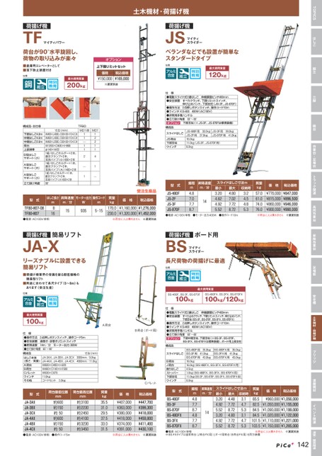 TOPICSはしご脚立三脚踏台作業台・足場台トラック関連高所作業台昇降作業台足場板安全柵土木機材・荷揚げ機ブリッジ運搬機材イベント関連温室・園芸関連荷揚げ機 TFマイティパワー荷台が90°水平旋回し、荷物の取り込みが楽々■倉庫用エレベーターとして■落下防止装置付き仕様CFO最大使用質量200kg構成品・主仕様下部はしご4.0m中間はしご4.0m中間はしご2.0m荷台上部滑車B型はしごサポート(小)A型はしごサポート(大)A型はしごサポート(小)立て掛け角度寸法(mm)W460×L4000、C60×30×10×2.3tW460×L4000、C60×30×10×2.3tW460×L2000、C60×30×10×2.3tW1200×D630×H900φ140×W221組/はしごホルダー×2本、直交クランプ×2本、支持パイプ(小)600×2本1組/はしごホルダー×1本、直交クランプ×2本、支持パイプ(大)1400×2本1組/はしごホルダー×1本、直交クランプ×2本、支持パイプ(小)600×2本90°TFBOMD7-0811—112—1オプション上下限リミットセット価格¥150,000税込価格¥165,000※運賃別途MD71221141—型式TFBO-MD7-08TFBO-MD7はしご長さm816●電源:AC100V単相昇降速度m/分モーター出力W操作コードm質量kg価格税込価格受注生産品159355・15170.0230.0¥1,160,000¥1,320,000¥1,276,000¥1,452,000※荷台に人は乗れません※運賃別途荷揚げ機 簡易リフトJA-Xリーズナブルに設置できる簡易リフト■荷揚げ機業界の常識を破る超低価格の簡易型リフト■用途に合わせて長尺タイプ(5〜8m)もあります(受注生産)仕様AFO最大使用質量100kg仕様●操作方法2点押しボタンスイッチ、操作コード5m●安全装置過巻き・逆巻きリミットスイッチ●昇降速度14m/分モーター出力300W●立て掛け角度65°~90°構成品はしご本体(長さ/質量)A荷台B荷台Cパレットウインチその他JA-3AX、JA-3BX、JA-3CX3000mm/9.0kgJA-4AX、JA-4BX、JA-4CX4000mm/11.0kgW600×D450×H225W480×D140×H1500W530×D37011.0kgコードセット3.0kg寸法(mm)A荷台B荷台〈ボード用〉Cパレット型式荷台最低位置mm荷台最高位置mmJA-3AXJA-3BXJA-3CXJA-4AXJA-4BXJA-4CX約600約150約50約600約150約50約3100約2230約2450約4100約3230約3450質量kg35.531.029.537.533.031.5価格¥407,000¥363,000¥380,000¥418,000¥374,000¥391,000税込価格¥447,700¥399,300¥418,000¥459,800¥411,400¥430,100●電源:AC100V単相●操作コード5m※荷台に人は乗れません※運賃別途土木機材・荷揚げ機荷揚げ機 JSマイティスライダーベランダなどでも設置が簡単なスタンダードタイプ仕様AFO最大使用質量120kg仕様●電動スライド式2連はしご伸縮調整ピッチ400mm●安全装置すべりクラッチ、下限リミットスイッチ、伸び止めバンド、下部支柱(JS-3F、JS-870F)●操作方法2点押しボタンスイッチ、操作コード10m●ウインチKS-400400W(AC100V)●非常用手巻ハンドル●立て掛け角度60°~80°オプション下部支柱(※JS-3F、JS-870Fは標準装備)構成品スライドはしごJS荷台下部支柱ウインチJS-480F用33.0kgJS-2F用37.0kg16.0kg11.0kg(JS-3F、JS-870F用)8.0kgJS-3F用39.0kgJS-870F用41.0kg型式JS-480FJS-2FJS-3FJS-870F昇降速度m/分14揚程m4.87.07.78.7スライドはしご寸法m最小3.204.624.925.52最大4.807.027.728.72収納時3.24.54.85.3●電源:AC100V単相●モーター出力400W●操作コード10m価格税込価格質量kg57.0¥847,00061.0¥896,50074.0¥946,00076.0¥990,000※荷台に人は乗れません※運賃別途¥770,000¥815,000¥860,000¥900,000荷揚げ機 ボード用BSマイティスライダー長尺荷物の荷揚げに最適仕様AFO最大使用質量BS-480F、BS-3F、BS-870F100kgBS-480FX、BS-3FX、BS-870FX100kg/120kg仕様●電動スライド式2連はしご伸縮調整ピッチ400mm●安全装置すべり止めクラッチ、下限リミットスイッチ、伸び止めバンド、下部支柱(BS-3F、BS-870F、BS-3FX、BS-870FX)●操作方法2点押しボタンスイッチ、操作コード10m●ウインチKS-400400W(AC100V)●非常用手巻ハンドル●立て掛け角度60°~80°オプション下部中間支柱、下部支柱(※BS-3F、BS-870F、BS-3FX、BS-870FXは標準装備)、ボード用上部支柱構成品スライドはしごB荷台J荷台曲りはしごストッパー下部支柱ウインチ型式BS-480FBS-3FBS-870FBS-480FXBS-3FXBS-870FXBS-480FX用35.0kgBS-3FX用41.0kgBS-870FX用43.0kgBS-480F用35.0kgBS-3F用41.0kgBS-870F用43.0kg18.0kg16.0kg(BS-480FX、BS-3FX、BS-870FX用)4.5kg1.0kg(BS-480FX、BS-3FX、BS-870FX用)11.0kg(BS-3F、BS-870F、BS-3FX、BS-870FX用)8.0kg昇降速度m/分14揚程m4.87.78.74.87.78.7収納時スライドはしご寸法m最小3.204.925.523.204.925.52最大4.487.728.724.807.728.723.14.75.33.14.75.3質量kg65.582.584.584.5101.5103.5●電源:AC100V単相※BS-FXタイプは通常荷台(J荷台FX用)とボード用荷台(B荷台FX用)を両方装備価格税込価格¥960,000¥1,050,000¥1,090,000¥1,020,000¥1,110,000¥1,150,000¥1,056,000¥1,155,000¥1,199,000¥1,122,000¥1,221,000¥1,265,000※荷台に人は乗れません※運賃別途142