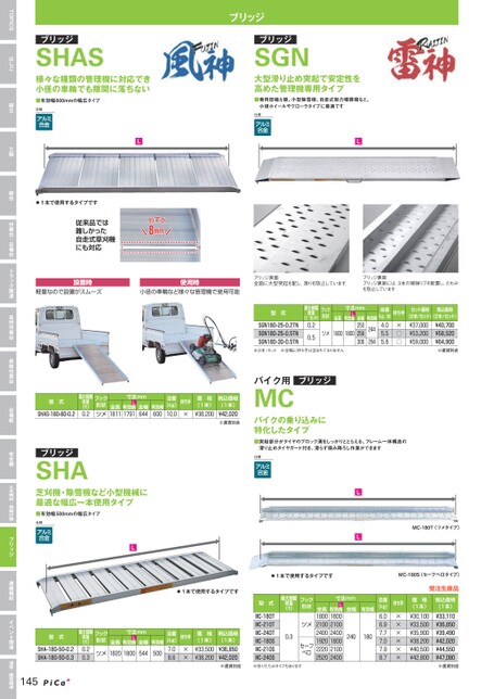 ブリッジSHAS様々な種類の管理機に対応でき小径の車輪でも隙間に落ちないブリッジブリッジSGN大型滑り止め突起で安定性を高めた管理機専用タイプ■有効幅600mmの幅広タイプ仕様A◀L■乗用田植え機、小型除雪機、自走式動力噴霧機など、小径ホイールやクローラタイプに最適です仕様A◀▶L▶⃝1本で使用するタイプです従来品では難しかった自走式草刈機にも対応設置時軽量なので設置がスムーズ使用時小径の車輪など様々な管理機で使用可能ブリッジ表面全面に大型突起を配し、滑りを防止していますブリッジ裏面ブリッジ裏面には、3本の補強リブを配置し、たわみを防止しています型式SGN180-25-0.2TNSGN180-25-0.5TNSGN180-30-0.5TN最大積載(t/セット)質量0.20.5フック形状全長寸法mmL有効長ツメ18001800※2本/セット※全幅に持ち手は含まれておりません全幅250256306自重(kg/本)持ち手×○○4.05.55.8有効幅244294セット価格税込価格(2本/セット)(2本/セット)¥37,000¥53,200¥59,000¥40,700¥58,520¥64,900※運賃別途型式SHAS-180-60-0.2質量最大積載(t)0.2寸法mmLフック形状ツメ1811全長有効長全幅6441791自重(kg)持ち手10.0×価格(1本)¥38,200有効幅600税込価格(1本)¥42,020※運賃別途ブリッジSHA芝刈機・除雪機など小型機械に最適な幅広一本使用タイプ■有効幅500mmの幅広タイプ仕様A◀L▶ブリッジバイク用MCバイクの乗り込みに特化したタイプ■突起部分がタイヤのブロック溝をしっかりととらえる、フレーム一体構造の滑り止めタイヤガード付き。滑らず積み降ろし作業ができます仕様A◀◀LL▶MC-180T(ツメタイプ)▶⃝1本で使用するタイプですMC-180S(セーフベロタイプ)⃝1本で使用するタイプです型式SHA-180-50-0.2SHA-180-50-0.3質量最大積載(t)0.20.3145フック形状寸法mmL全長有効長全幅有効幅ツメ18201800544500自重(kg)持ち手××7.08.6価格(1本)¥33,500¥38,200税込価格(1本)¥36,850¥42,020※運賃別途寸法mm全幅有効幅240180最大積載質量(t)フック形状0.3ツメセーフベロ型式MC-180TMC-210TMC-240TMC-180SMC-210SMC-240S※折りたたみタイプもありますL全長有効長180018002100210024002400180019202220210024002520自重(kg)持ち手6.06.97.77.07.98.7××××××価格(1本)¥30,100¥33,500¥35,900¥38,200¥40,500¥42,800受注生産品税込価格(1本)¥33,110¥36,850¥39,490¥42,020¥44,550¥47,080※運賃別途TOPICSはしご脚立三脚踏台作業台・足場台トラック関連高所作業台昇降作業台足場板安全柵土木機材・荷揚げ機ブリッジ運搬機材イベント関連温室・園芸関連