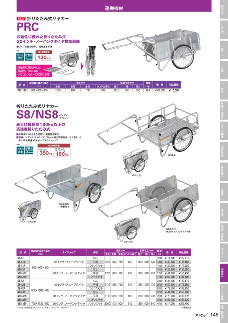 TOPICSはしご脚立三脚踏台作業台・足場台トラック関連高所作業台昇降作業台足場板安全柵土木機材・荷揚げ機ブリッジ運搬機材イベント関連温室・園芸関連運搬機材NEW折りたたみ式リヤカーPRC収納性に優れた折りたたみ式20インチ・ノーパンクタイヤ標準装備■アルミ合金を使用し、超軽量を実現仕様AH最大積載質量130kg収納時に取り外した部品も一体になりよりコンパクトに収まります型式荷台幅×長さ×深さmmPRC-130605×905×315寸法mm収納寸法mm全長1809全幅894全高730ハンドル長さ843長さ1015幅350高さ760質量kg18.7価格税込価格¥100,000¥110,000折りたたみ式リヤカーS8/NS8ハンディキャンパー最大積載質量180kg以上の高強度折りたたみ式■高強度アルミ合金を使用し、超軽量を実現■側板パンチングメタルタイプ、フレーム材に高剛性角パイプを用いた最大積載質量350kgタイプもラインナップ仕様AH最大積載質量NS8-A3P350kgS8-A1、A2・NS8-A1、A2180kgNS8-A1収納状態NS8-A2S側板付き収納状態荷台幅×長さ×深さmmタイヤタイプ側板600×900×310800×1200×40020インチ・チューブタイヤ20インチ・ノーパンクタイヤ20インチ・チューブタイヤ20インチ・ノーパンクタイヤ720×1130×55026インチ・ノーパンクタイヤパンチングメタルなし平板なし平板なし平板なし平板パンチングメタルパンチングメタルパンチングメタルパンチングメタル型式S8-A1S8-A1SS8-A1PNS8-A1NS8-A1SNS8-A1PS8-A2S8-A2SS8-A2PNS8-A2NS8-A2SNS8-A2PNS8-A3P※S付きは側板付きタイプ、P付きは側板パンチングメタル付きタイプNS8-A1P側板パンチングメタル付き収納状態寸法mm収納寸法mm全長全幅全高ハンドル長さ長さ幅高さ1700 870715810 9703106201700 870715810 970310620211010807308101290310730211010807302080117090081081012903107301260500940自重kg16.018.018.015.017.017.023.026.026.022.025.025.040.0価格¥111,100¥130,500¥158,200¥123,200¥141,300¥167,900¥134,100¥160,600¥171,500¥144,900¥172,700¥181,200¥314,000税込価格¥122,210¥143,550¥174,020¥135,520¥155,430¥184,690¥147,510¥176,660¥188,650¥159,390¥189,970¥199,320¥345,400※運賃別途148