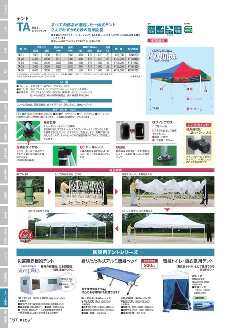 テントTAミスタークイックテントすべての部品が連結した一体式テント2人でわずか60秒の簡単設営■豊富なサイズとカラーバリエーションで、あらゆるシーンに合わせてぴったりのものをお選びいただけます■フレームは総アルミタイプで軽くてサビに強いです型式TA-11TA-22TA-24TA-33TA-36寸法mm間口18002400480030006000奥行18002400240030003000最高軒高mm18101810222022202220全高mm25402700338035303530収納寸法mm幅410410530410530奥行410410410410410高さ13101310158015801580質量kg2023452951価格¥82,000¥100,000¥165,000¥153,000¥217,000※上記以外のサイズもあります。お問い合わせください※天幕・横幕に、ロゴマーク・文字のプリントができます(料金別途)※収納寸法は天幕を被せた状態の寸法となります税込価格¥90,200¥110,000¥181,500¥168,300¥238,700※運賃別途材質合●フレーム/支柱アルミ、桁アルミ、アルマイト加工●接●天幕生地/ リエステル100%(500D)、裏面ポリウレタンコーティング、 部/強化プラスチック(グラスファイバー+ナイロン6化合物)防水・防炎加工、紫外線吸収剤配合、紫外線遮蔽率99.9%フレーム収納袋、天幕収納袋、杭4本(TA-24・36は6本)、自在ロープ4本付属品カラーバリエーション■白 ■青 ■緑 ■黄 ■赤 ■ピンク ■黒 ■ダークグリーン ■ダークブラウン ■ダークブルー の単色のほか、2色使い等もあります※横幕には透明タイプもあります❶接合部スムーズなオートピーク式機構。接合部に強化プラスチック(グラスファイバー+ナイロン6化合物)を使用することにより、こすれやサビを防止します。天幕の張りを持たせるために、オートピーク内に強固な弾力スプリングを内蔵しています旧タイプ❷調節ダイヤルセンターポール下部のダイヤルで天幕の張り具合を調節できます(実用新案出願中)❸ラバーキャップ天幕の生地を傷めないようにラバーキャップを使用しています❺台座脚の台座は杭を打っても割れないスチール板を挟み込んで強度アップ例:TA-362人で両端を持ち、広げる四隅をロックし、天幕を整える組立手順仕様認定規格AEFM※工具不要 特許登録済●TA-33❹サイドクロスフレームリブを2枚追加して強度を高めました。●板厚1.5mm●リブ板厚1.25mm●●●●●ここがポイント!●外部付けストッパーノブ式メインフレーム下部をスライドして、自動でロックされる安全設計です高さを合わせて完成平行に2本ずつ、高さを整えるわずか60秒で設営完了災害時多目的テント屋外の避難所、応急救護室、簡易宿泊テントに防災用テントシリーズ折りたたみ式アルミ簡易ベッド最大使用質量200kg簡易トイレ・更衣室用テント更衣室やトイレとして使用できる多目的テント最大使用質量200kg凹凸のある場所にも設置できますST-3060¥391,000(税込¥430,100)※運賃別途●床張サイズ:6000×3000×3530Hmm●最高軒高:2040mm●全高:3350mm●1名約1畳のスペースで8名就寝できます※横幕の高さにあわせた場合となりますKB-1900(190cmサイズ)¥46,000(税込¥50,600)※運賃別途●設置寸法:630×1900×460Hmm●収納寸法:260×180×950mm●質量(自重):12.2kgKB-2000(200cmサイズ)¥50,000(税込¥55,000)※運賃別途●設置寸法:700×2000×460Hmm●収納寸法:260×180×1000mm●質量(自重):12.8kg157WT-12¥98,000(税込¥107,800)※運賃別途●床張サイズ:1200×1200×2435HmmTOPICSはしご脚立三脚踏台作業台・足場台トラック関連高所作業台昇降作業台足場板安全柵土木機材・荷揚げ機ブリッジ運搬機材イベント関連温室・園芸関連