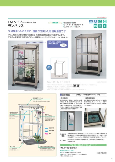 115(cm)FAL-1811BLライトブロンズ4989247303012●幅112×奥行65.7×高さ185.2(cm)●設置寸法/幅115×奥行70×高さ190(cm)●質量65.8kg●棚板6枚●アルミ製アルマイト仕上●5号鉢×9鉢/一棚当り●転倒防止リング付●コンセント×4口装備●キャブタイヤ電源コード使用●総消費電力/1200Wまで●総梱包数/5コ廃番※写真中の花鉢等は販売商品ではありません。開閉式天井パネル換気に便利な開閉式天井パネルを採用しています。(手動式)■主な機能大切な4つの機能がついています。<換気機能>温度調節器設定温度以上になると換気扇が作動して、暑い空気を外に追い出し、株を高温障害から守ります。又、急激な温度上昇により株を傷めることもありません。特に秋から春までの、温室内の温度が急変しやすい時期に活躍する機能です。<加温加湿機能>温度調節器設定温度以下になると加温加湿器が作動して、ヒーターによる加温で寒さを防ぐと同時にタンクの水で湿度低下を抑えます。電子温度調節器(FHA-PW10)加温加湿器と換気扇の作動温度を設定します。換気扇(FHJ-PF10)電子温度調節器と併用により自動的に暑い空気を外に出します。適温の微風適度な湿度暑気アジャスター水平を調節します。高さ調節範囲:1.8cm加温加湿器(FHM-PH50)電子温度調節器と併用により自動的に加温・加湿し、微風を環流します。微風環流機能遮光機能加温加湿器の中央に組み込まれたファンにより、ヒーターと連動して温室内に微風が環流します。この微風環流機能には、温室内温度を均一にする働きと、株に新鮮な空気を与えることによって植物の生育を助長する大切な働きがあります。日よけカーテンで余分な太陽光をカットし、自然の木もれ日を再現します。※遮光率50%FAL-1811BL用オプションパーツFAL-PT10棚板セット棚板を追加したい時に。●フック一体型棚板※棚受フックは不要です。●2枚組●スチールフレーム樹脂コーティング(棚板部分)●幅50.5×奥行55.6(cm)49892473035005天井パネルが開閉でき、換気に便利です。手動式70190温室設置寸法洋らん栽培に必要な機能<加温加湿・微風環流・換気・遮光>を備えています。すでに大型温室をお持ちの方には、観賞用セカンドハウスとしておすすめします。FALタイプ洋らん栽培用温室ランハウス大切な洋らんのために、機能が充実した栽培用温室です標準装備●加温加湿器●換気扇●ヒーターサーモ&換気扇サーモ●日よけカーテン●保温カバー2019年生産終了アジャスター