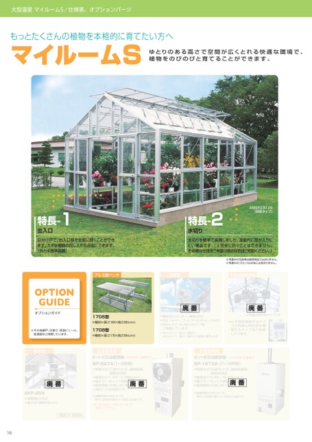大型温室マイルームS/仕様表、オプションパーツもっとたくさんの植物を本格的に育てたい方へマイルームSゆとりのある高さで空間が広くとれる快適な環境で、植物をのびのびと育てることができます。特長-1出入口引分け戸で、出入口部を全面に開くことができます。大きな植物の出し入れも自由にできます。(外カギ標準装備)AMS20302S(段窓タイプ)特長-2水切り水切りを標準で装備しました。温室内に雨が入りにくい構造です。(※完全に防ぐことはできません。その様な仕様をご希望の場合は別途ご相談ください。)※写真中の花鉢等は販売商品ではありません。※写真中のブロックは本体には含まれません。アルミ製ベンチ換気扇天窓自動開閉機OPTIONGUIDEオプションガイド※その他網戸、日除け、保温ビニール、加湿器など用意しています。1705型●幅50×長さ165×高さ85(cm)1708型●幅80×長さ170×高さ85(cm)廃番●電気式シャッター、単相100V●本体、シャッター、フード、サーモスタット、パネル付●25cmタイプと30cmタイプをご用意しています。※25cmタイプ:間口2.0間まで30cmタイプ:間口2.5間以上の温室に適用します。廃番※写真は両天窓タイプです●片天窓を開閉するタイプと同時に両天窓を開閉するタイプをご用意しています。攪拌扇石油暖房機石油暖房機2024年生産終了ポット式石油暖房機SP-527A(1〜6坪用)●燃焼方式:灯油ポット式、強制給気、強制対流型●暖房出力:1,870〜5,000kcal/h●電子サーモリニア制御式(0〜30℃)●使用燃料:灯油(JIS1号)※油タンクは別売です。廃番※掲載写真は本体のみです。取付には別途付属セット(別売)が必要です。※P.13の油タンク90ℓ(OT-90S)を併用してください。廃番SKF-25A●消費電力:25W●高さ20×直径46(cm)4989716000404162023年生産終了ポット式石油暖房機SP-1210A(7〜10坪用)●燃焼方式:灯油ポット式、強制給排気、強制対流型●暖房出力:4,000〜10,000kcal/h●電子サーモリニア制御式(0〜30℃)●使用燃料:灯油(JIS1号)廃番※掲載写真は本体のみです。取付には別途付属セット(別売)が必要です。